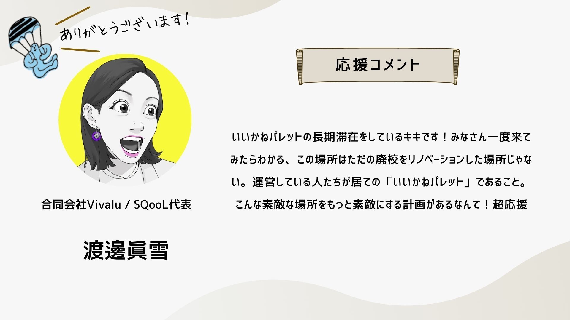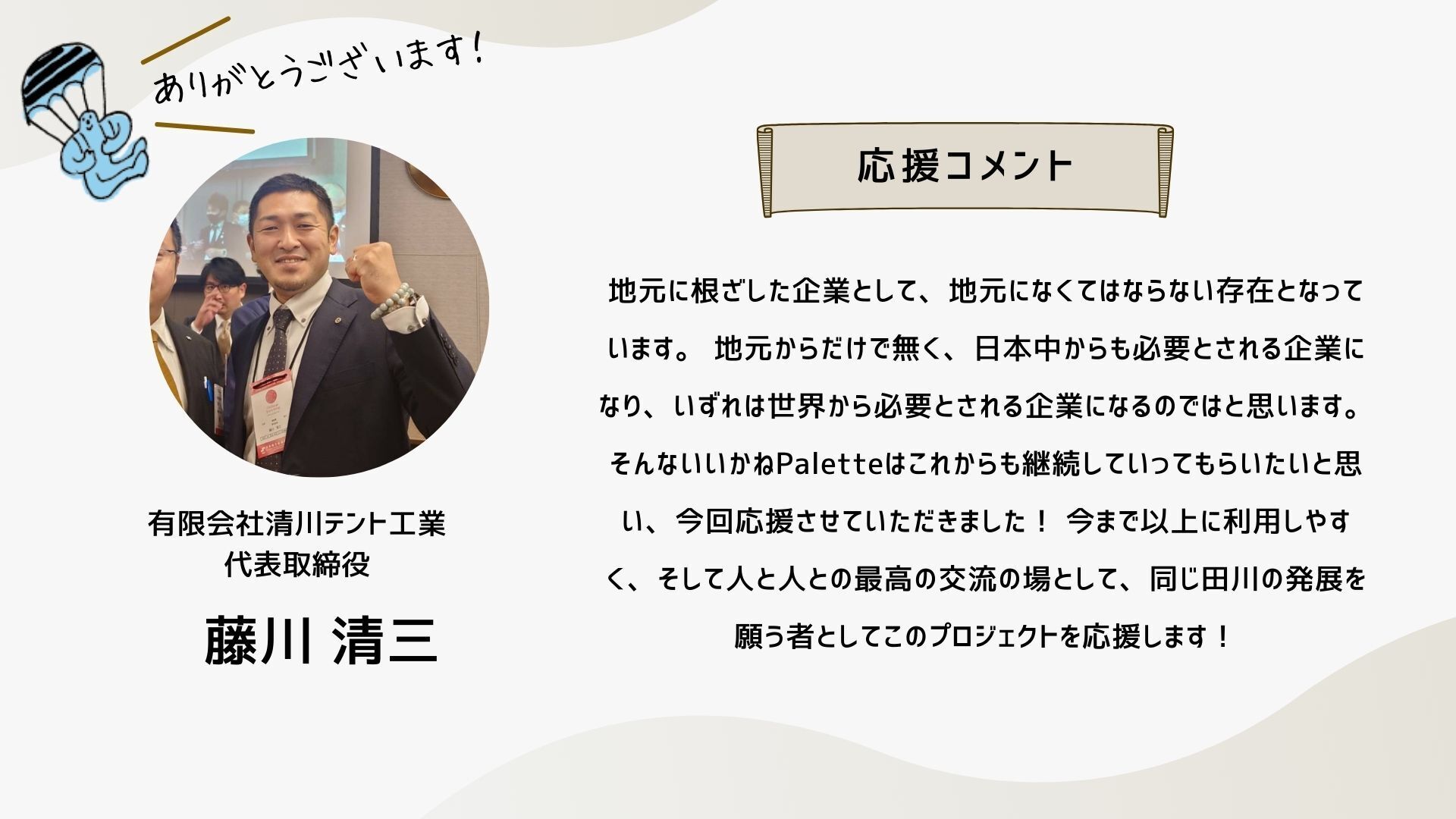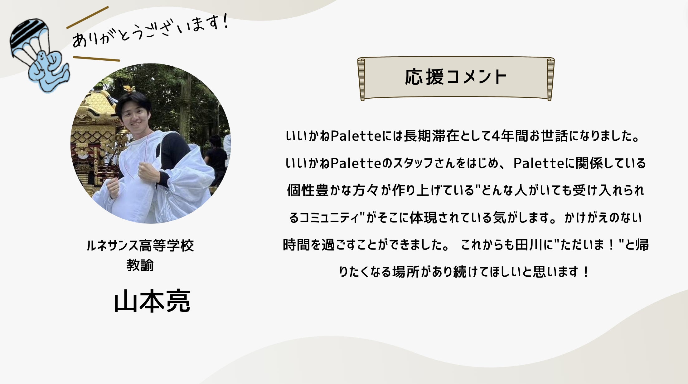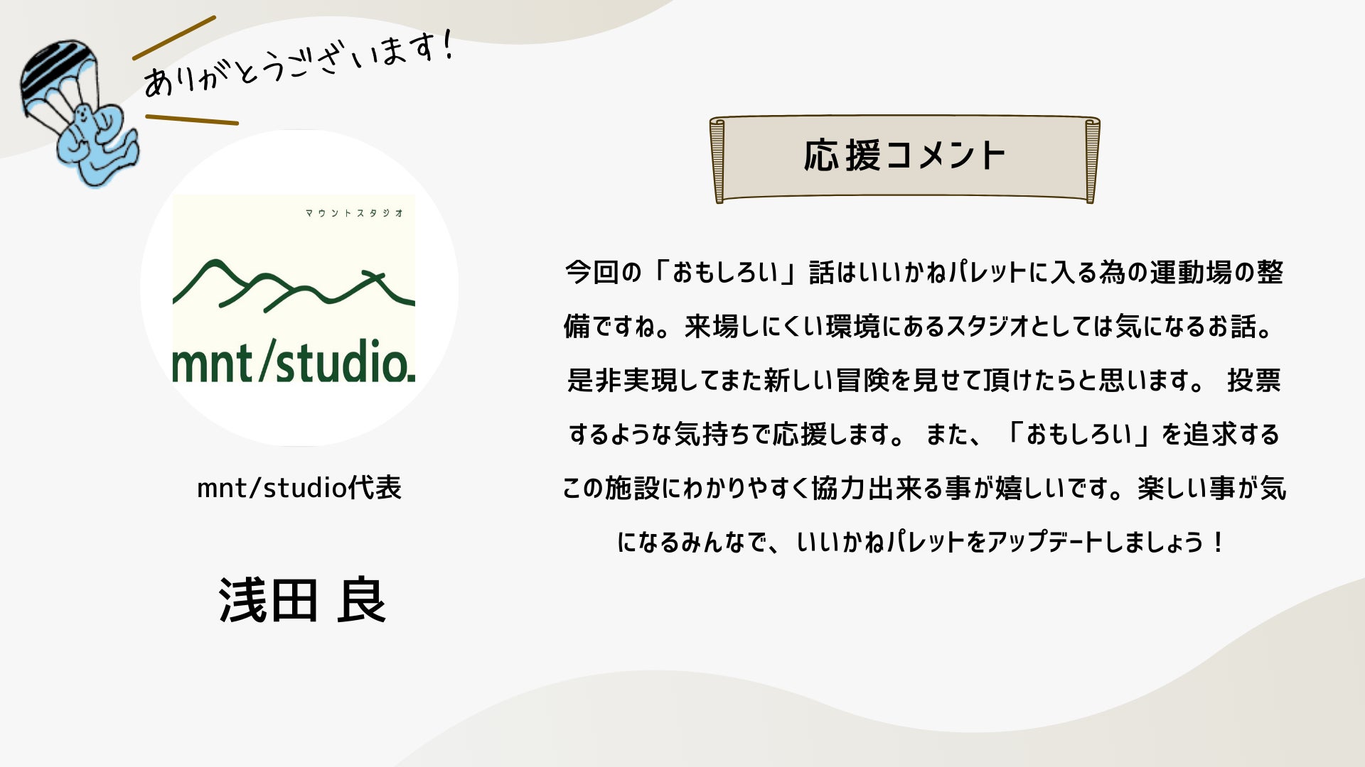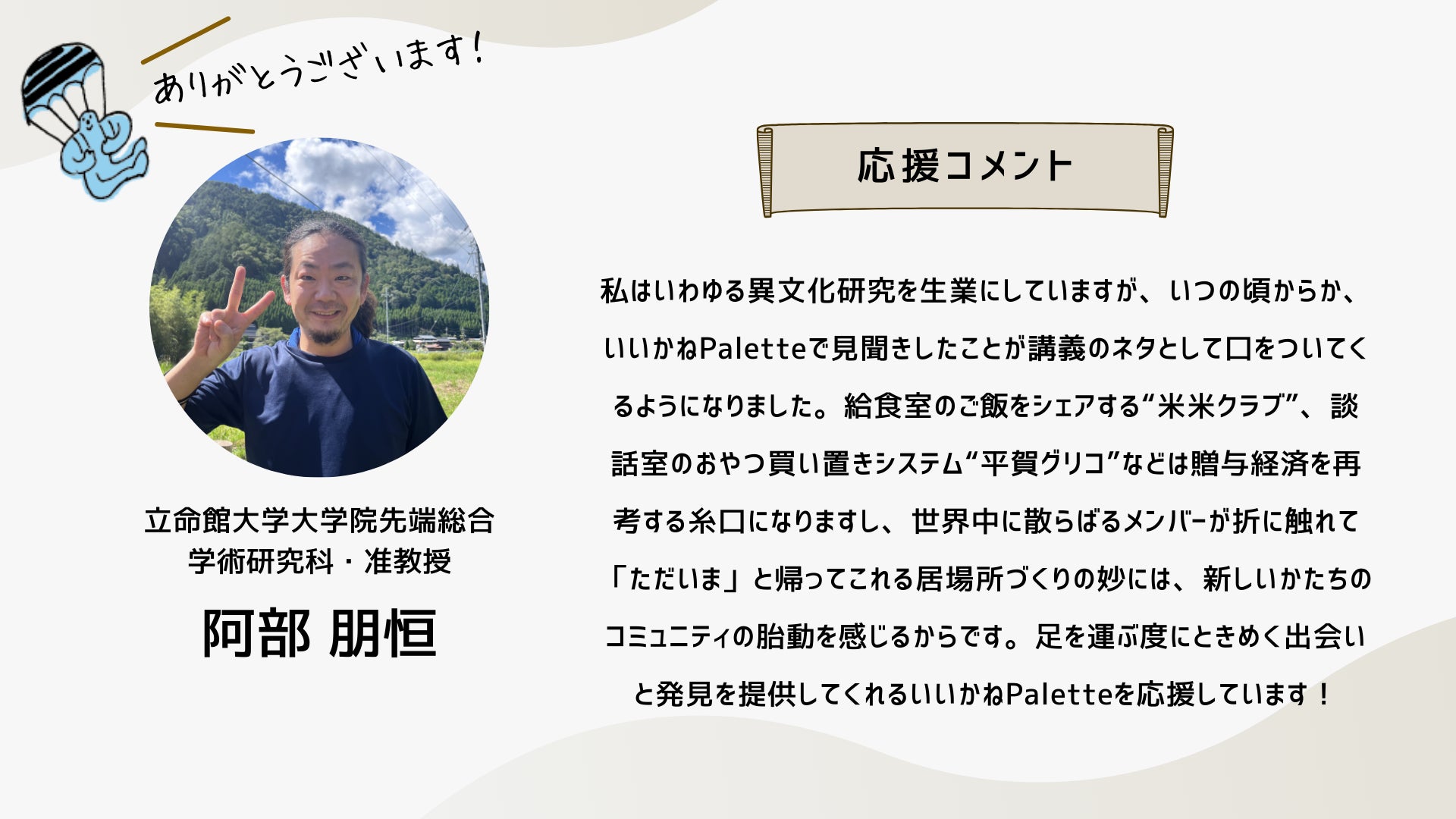 深井さんのコメントで支援決めてコテンにも入会しました。いつかいいかねパレットに泊まりたいです。