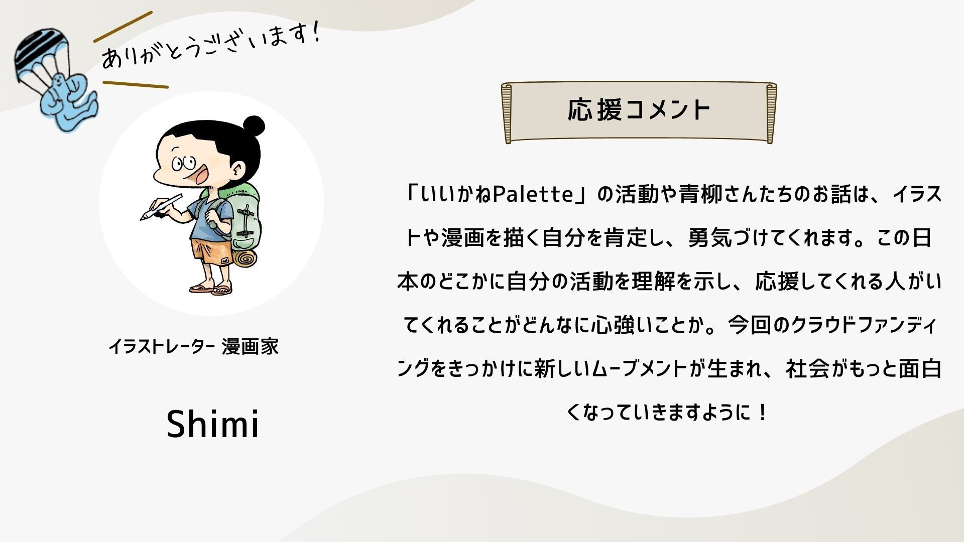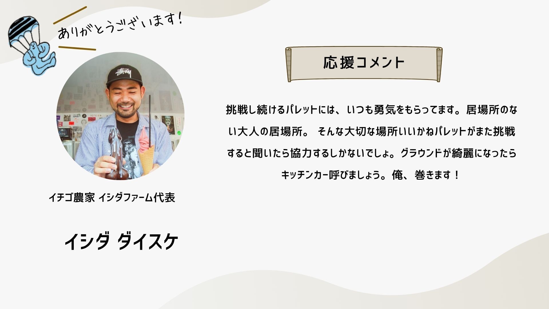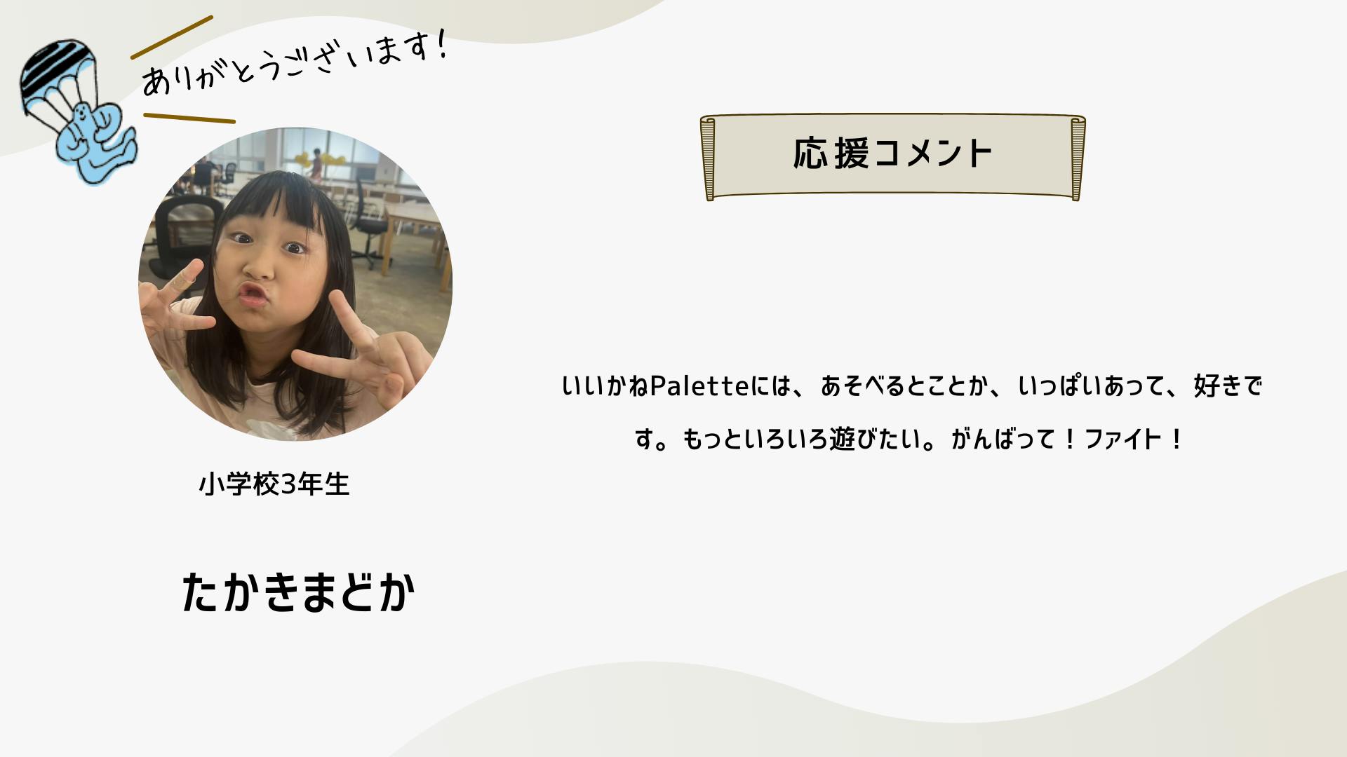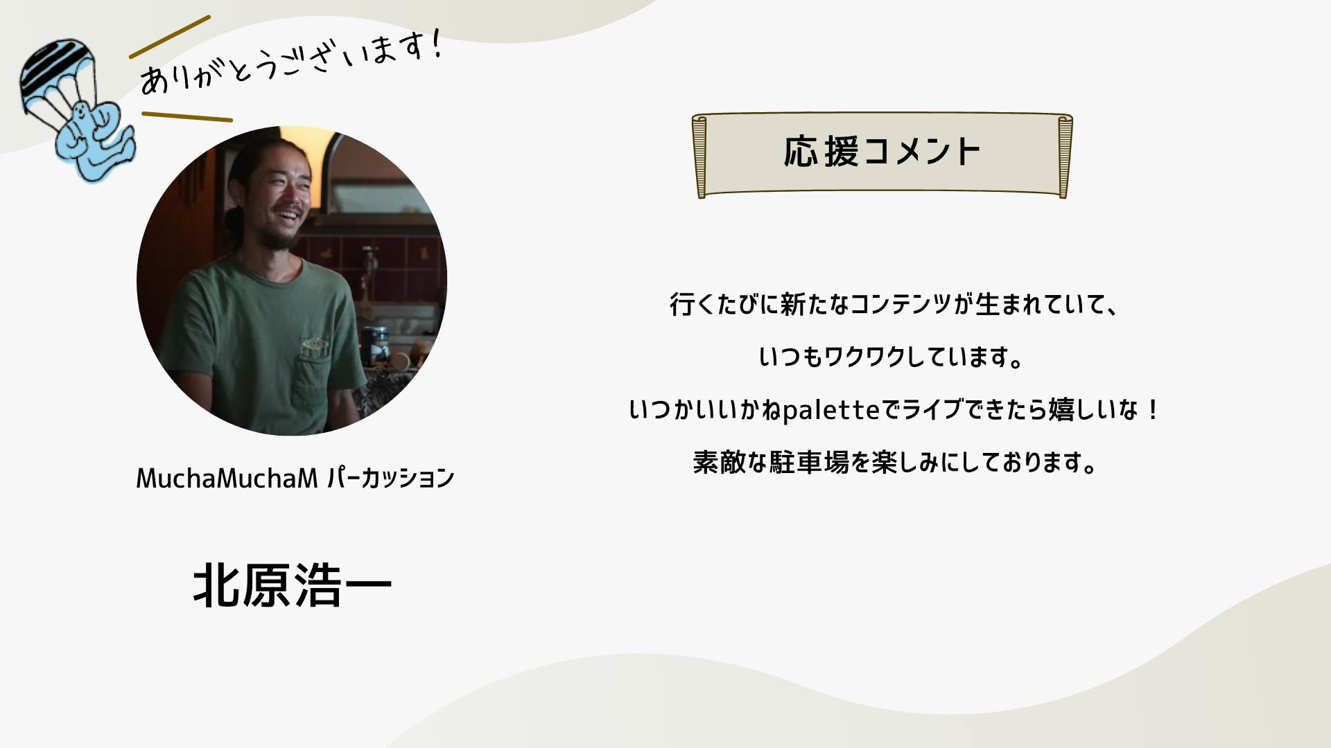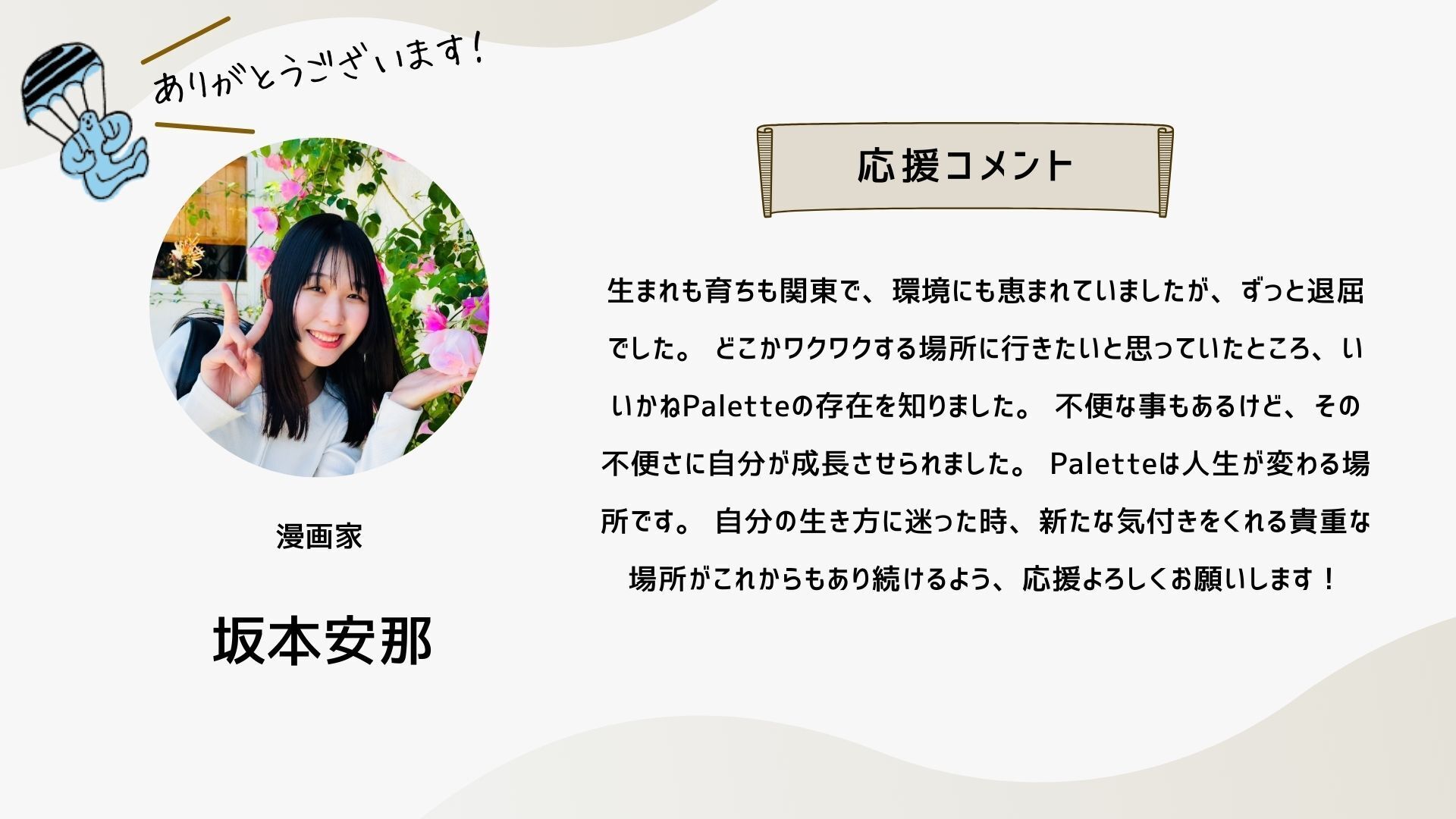 深井さんのコメントで支援決めてコテンにも入会しました。いつかいいかねパレットに泊まりたいです。