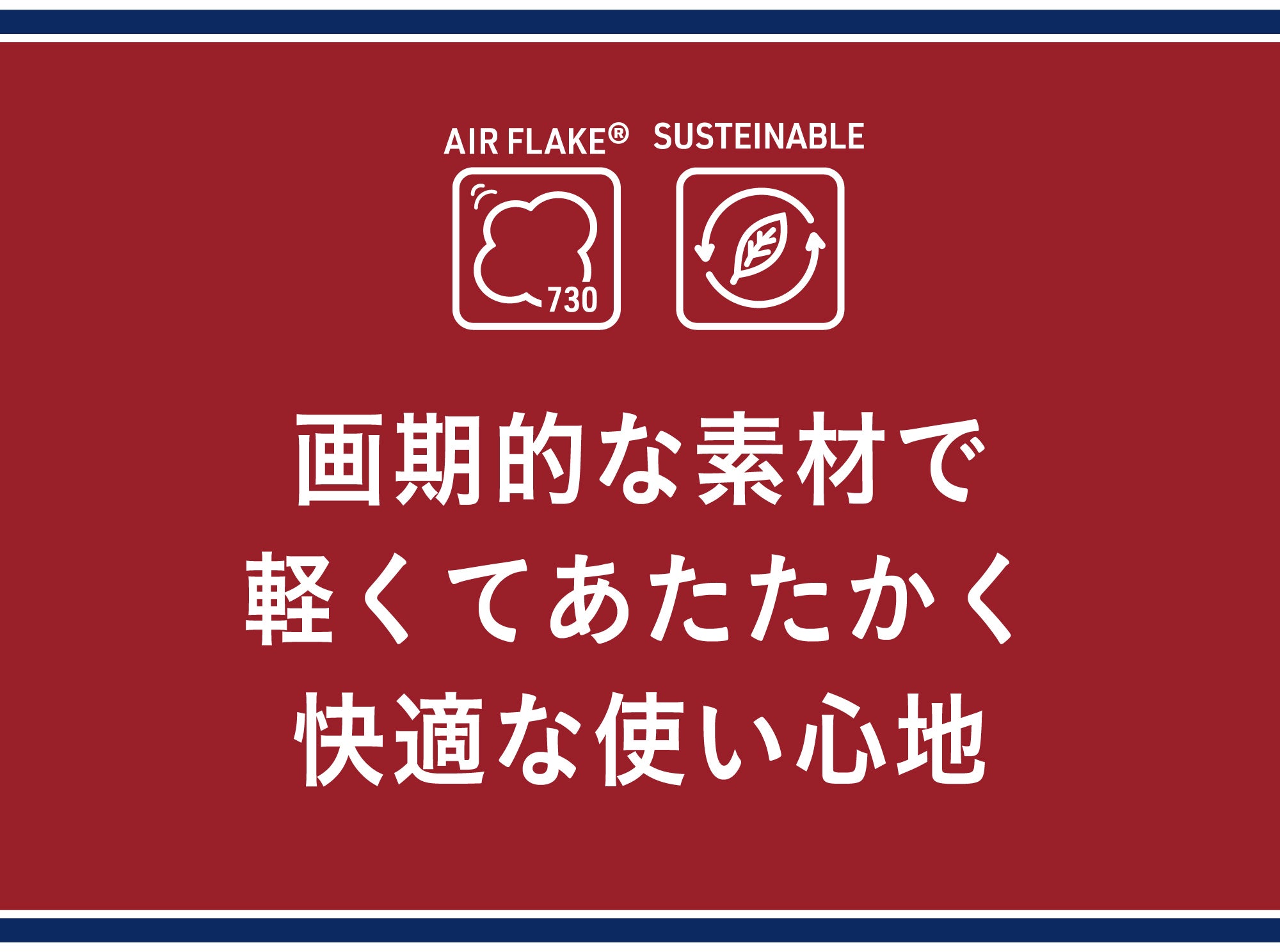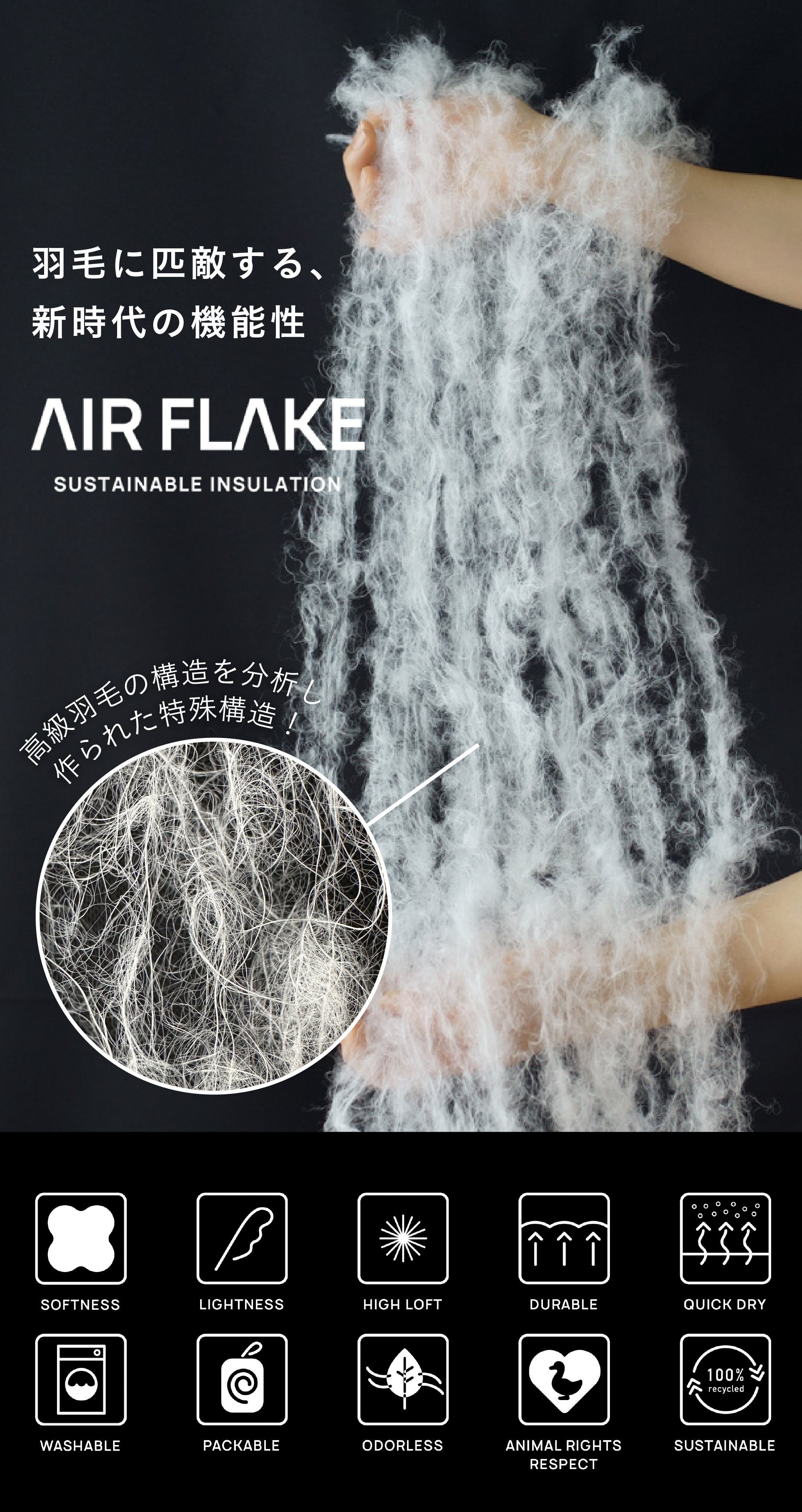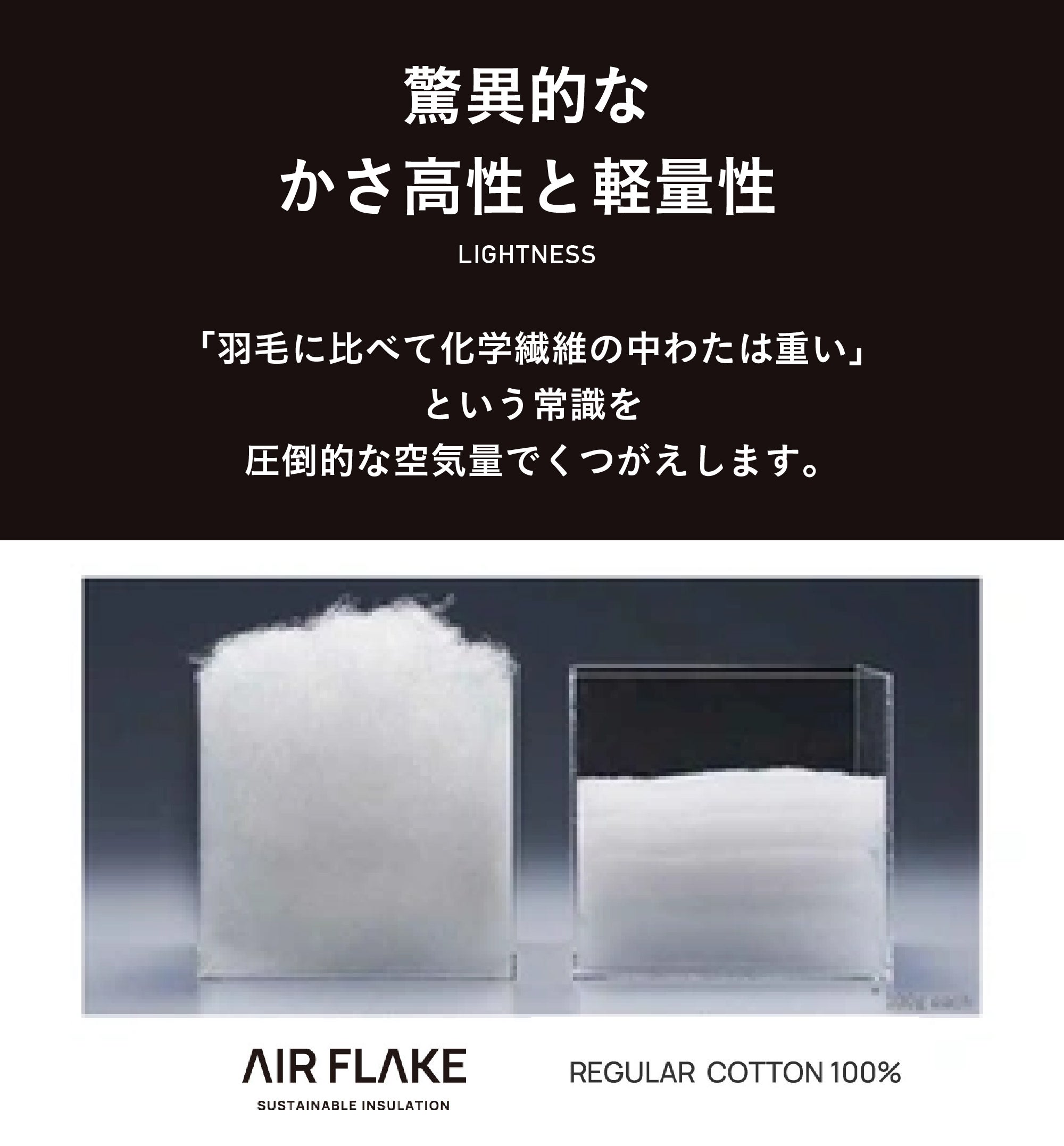 AIRFLAKE®️は、暖かな空気をたくさん含むため、化学繊維でも圧倒的な軽さでふかふかです。