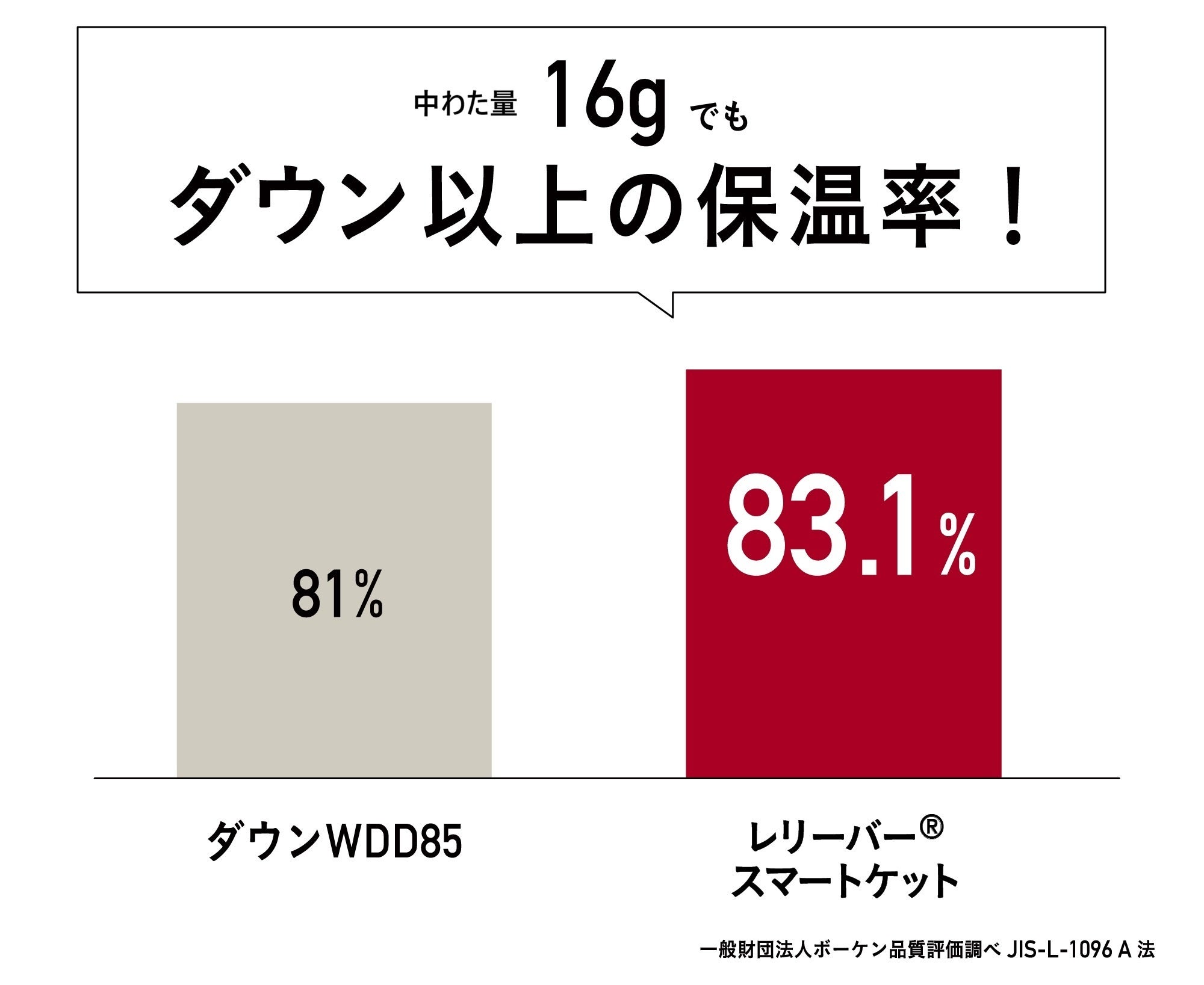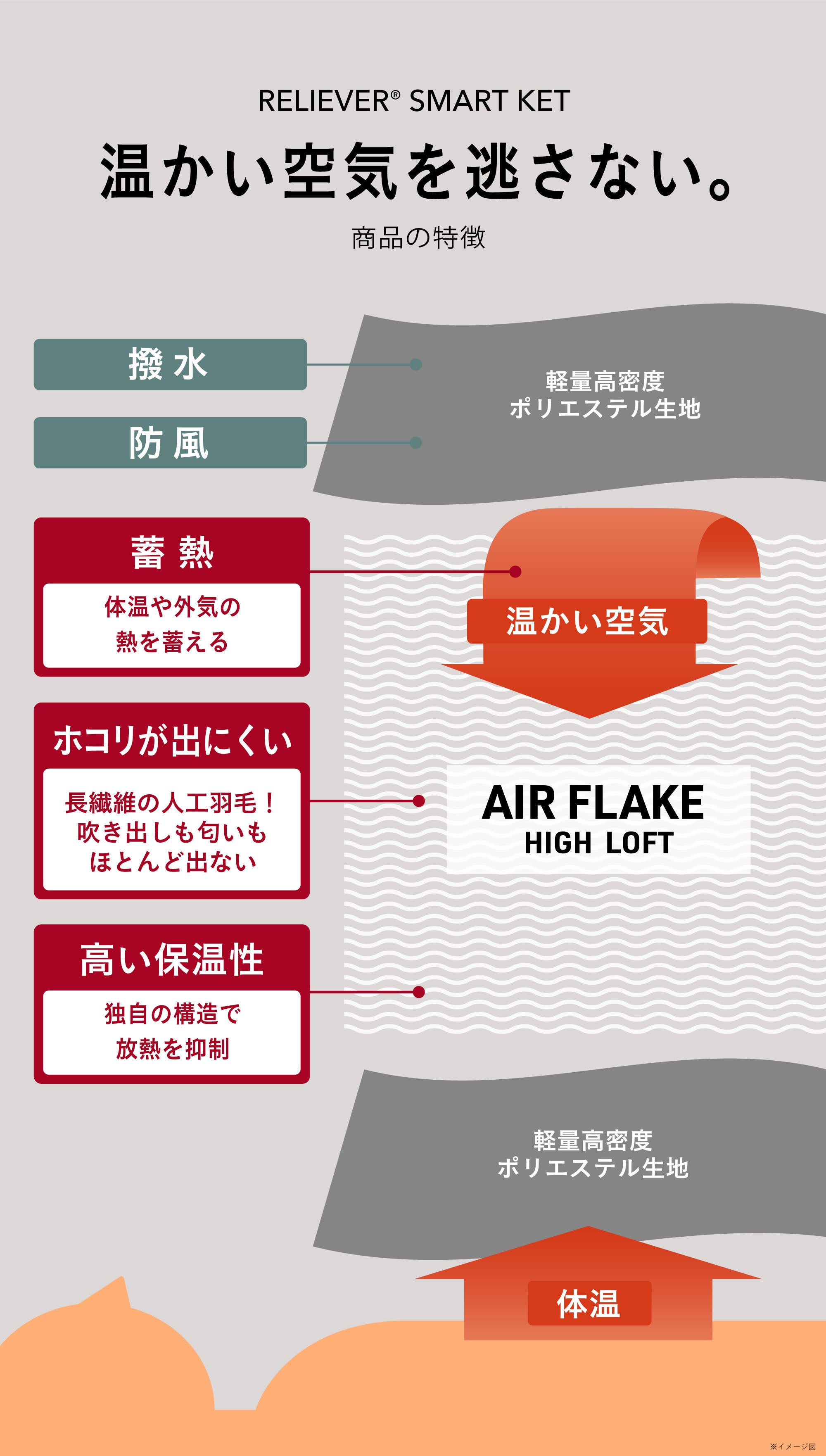 そのためレリーバー®スマートケットは、中わたAIRFLAKE®️の圧倒的な保温力で体温を保温し、あたたかい空気を逃しません。
