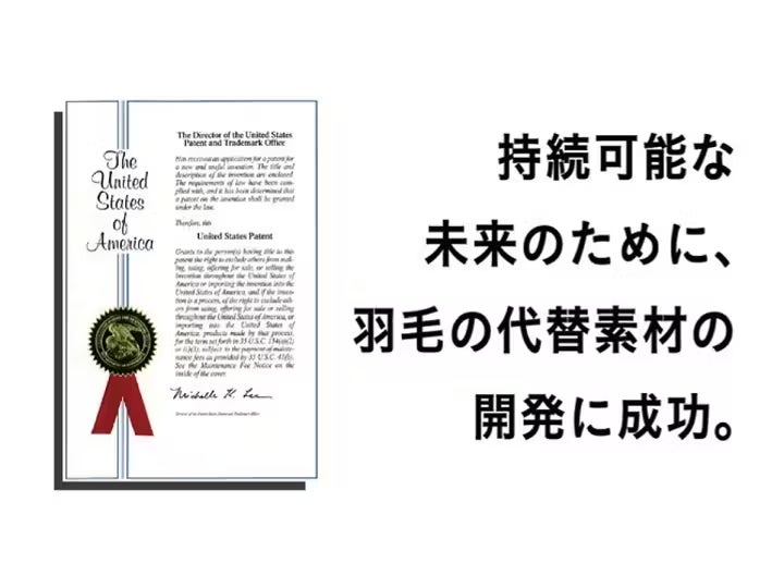 繊維3大発明と言われる、天然シルク→ナイロン、ウール→アクリル繊維、綿→ポリエステルができたように、次の4番目の『羽毛』が安定供給できるように。