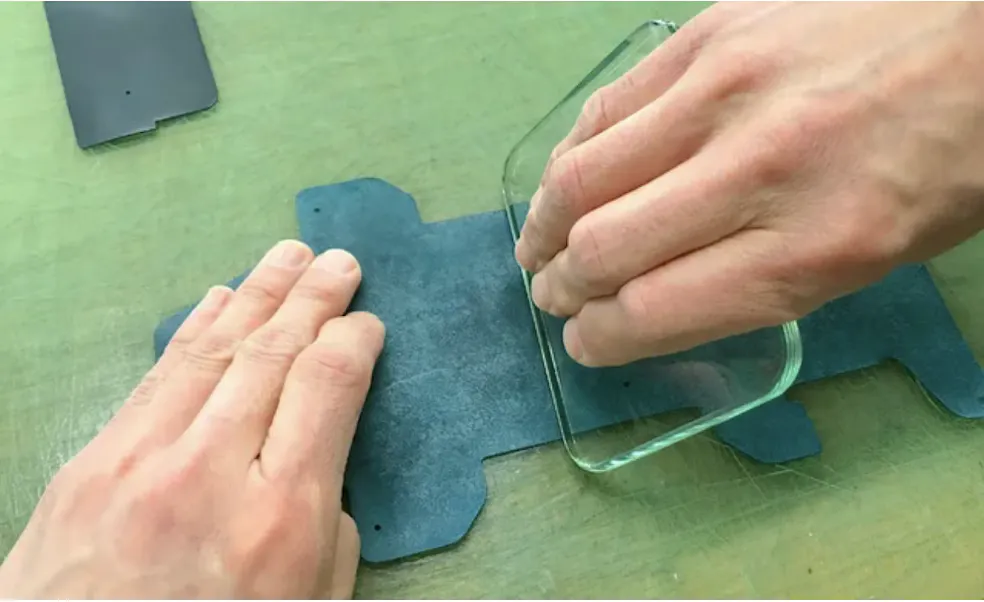 そして裏面を処理剤で平滑に仕上げ、断面をフノリで塗り仕上げます。本製品は顔料を使用せず染料仕上げを採用しているのも注目ポイントです。