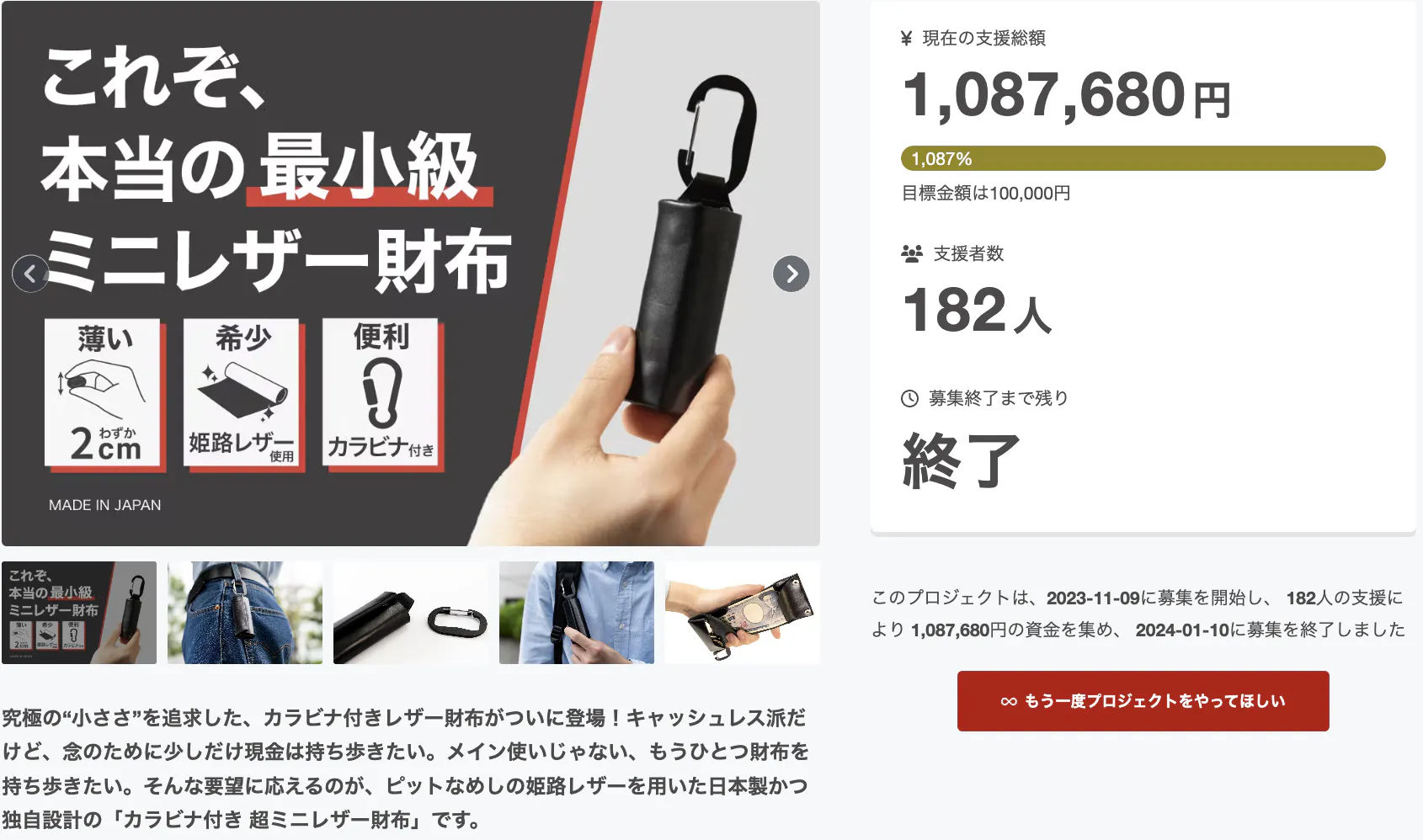 2025/07/22 12:27小さい財布のその先へ!キャッシュレス時代の最小級ウォレットONEをご支援いただいた皆様へ過日は、最小級ウォレットONEをご支援くださりありがとうございました。本日よりONEの最新作のプロジェクトがスタートしました!=====\\プロジェクトページはこちら//https://camp-fire.jp/projects/867407/view=====最新作の注目ポイントは、・鍵を1つ収納できるようになりました・カラビナだけでなくキーリングタイプも新登場・前回と同じデザインも引き続き購入できます・前回と同様、全6色のカラーバリエーション前回ご購入できなかった方、ご購入後にもうひとつ欲しいという方、ご友人や家族へのプレゼントにしたい方などなど、お得なリターンが売り切れる前に、ぜひお早めにGETしてくださいませ。ご不明点があればお気軽に問い合わせください。commerce@mediagene.co.jpmachi-ya originals一同 もっと見る