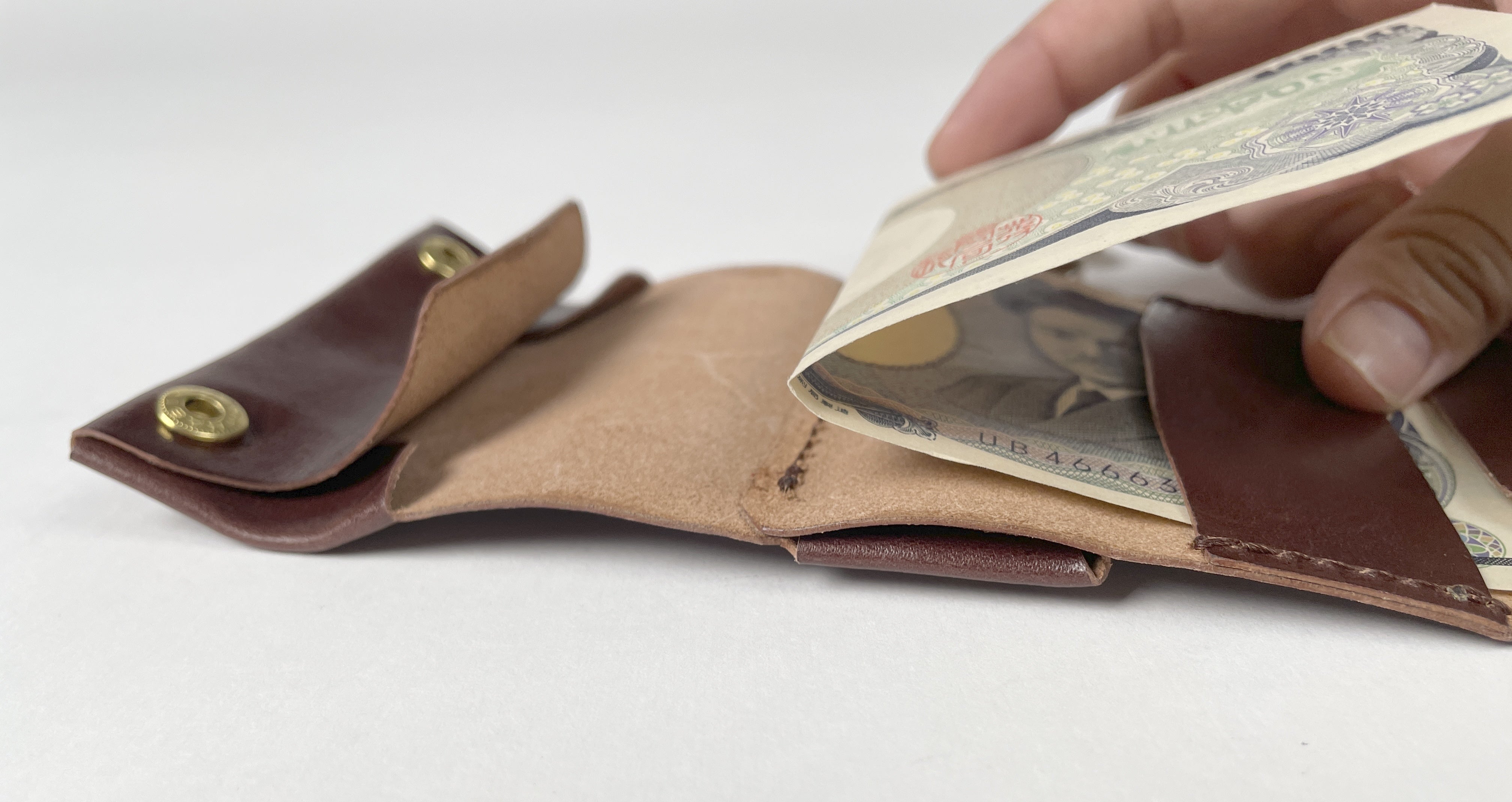 財布の中央のステッチにお札の2つ折りの折り目をそろえると、きれいに収納できます。