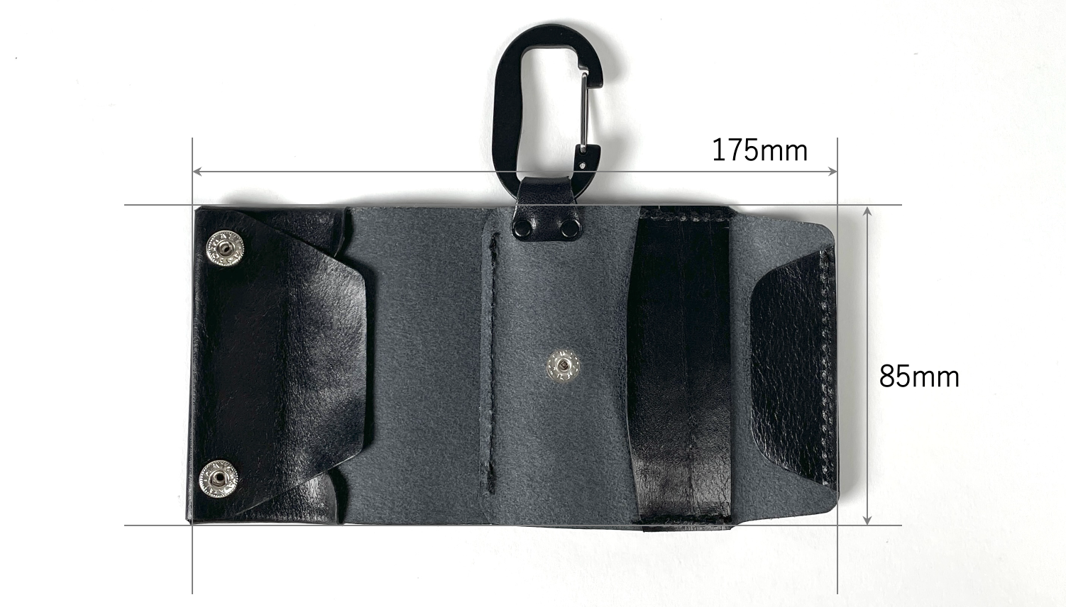 財布本体とカラビナの接続部分は、表革より厚い革を使用し強度を高めました。