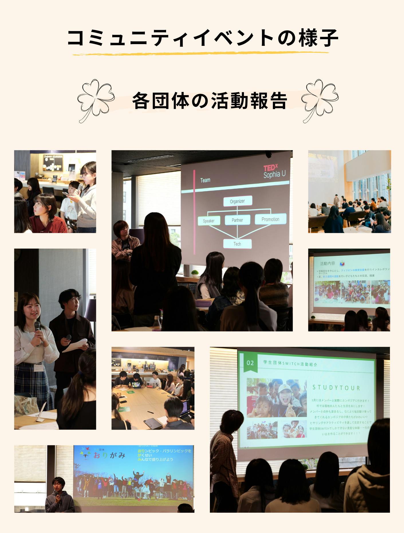コミュニティを通じて、多くの学生団体が一堂に集まりお互いの活動を紹介したり、交流機会を設けたり、企業やNPO・NGOの方をお呼びしたりしています。