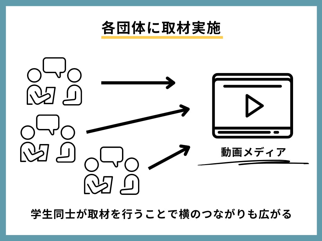 動画制作会社を起用して運営をサポートいただきながら、インタビュアーは主に私たち学生が行い、学生同士でインタビューを行い発信活動をしていきます。