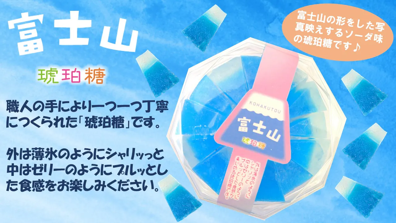 職人の手により一つ一つ丁寧につくられており、現在は弊社のみ取り扱いをしている唯一の商品です。『富士山琥珀糖』 は見た目も美しく、外はシャリっと中はプルっとした不思議な食感となっており、皆様からご好評いただいております。実際に、土産屋さんをメインに、道の駅、富士五湖、河口湖周辺 で30カ所ほどで販売しております。