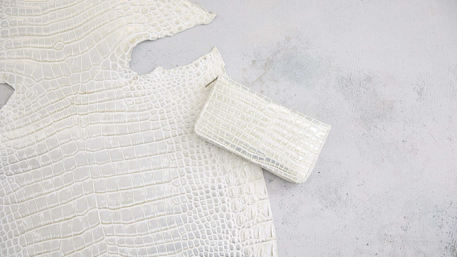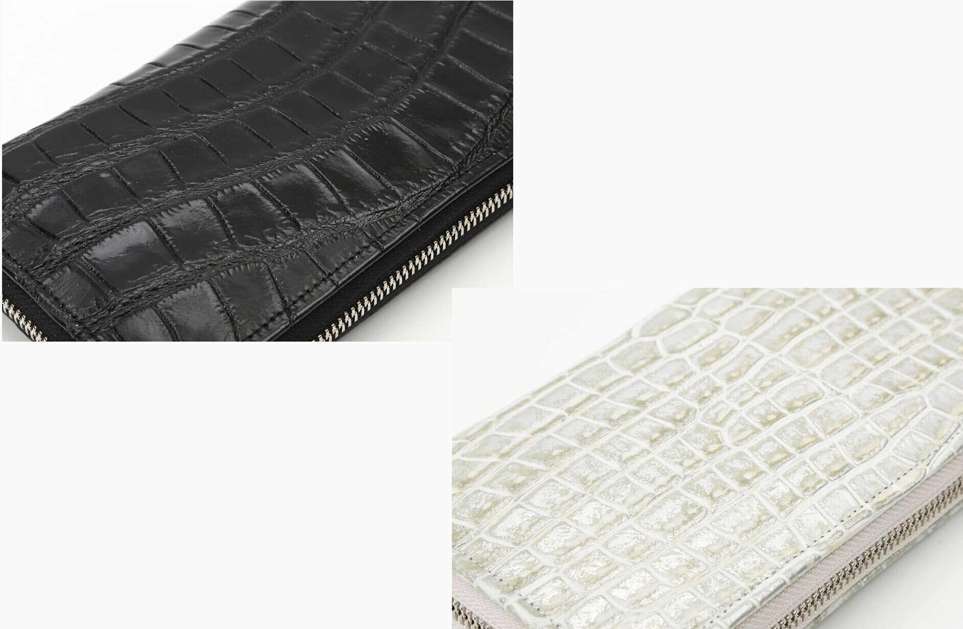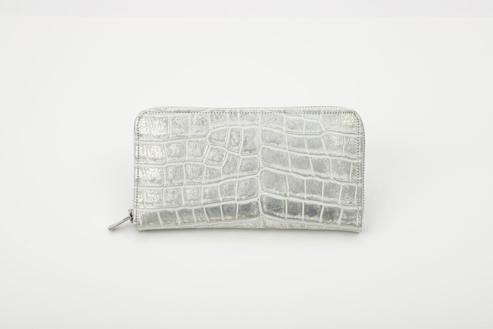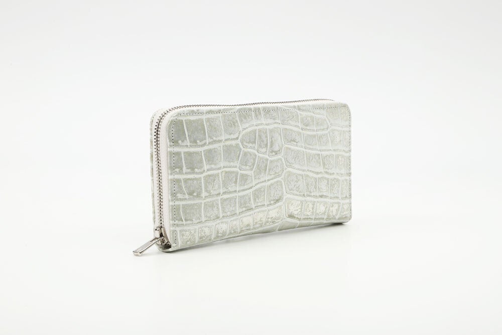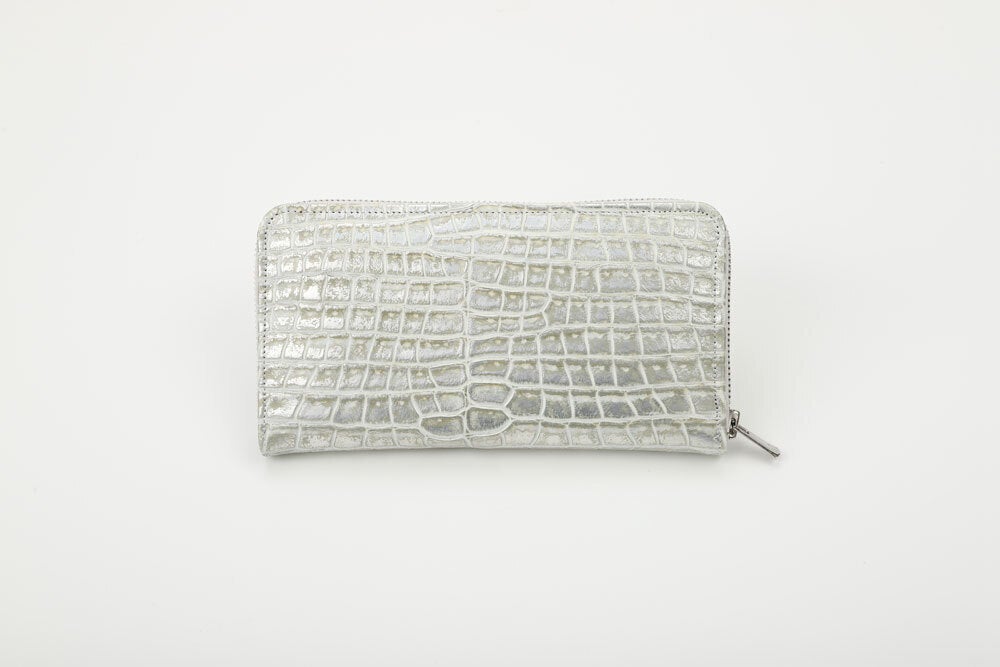 ポロサスクロコダイルの原皮をソフトになるように鞣します。そこから白色(マット仕上げ)に染色し、さらにその上からシルバーを吹きかけます。その後熟練の職人が絶妙なバランスでシルバーを残しながら拭き取り、深みのある表情を作り出しています。この白とシルバーのコントラストは手作業でしか生み出すこのとできない染色の匠によって作り上げられるもはや芸術品といっても過言ではない逸品です。