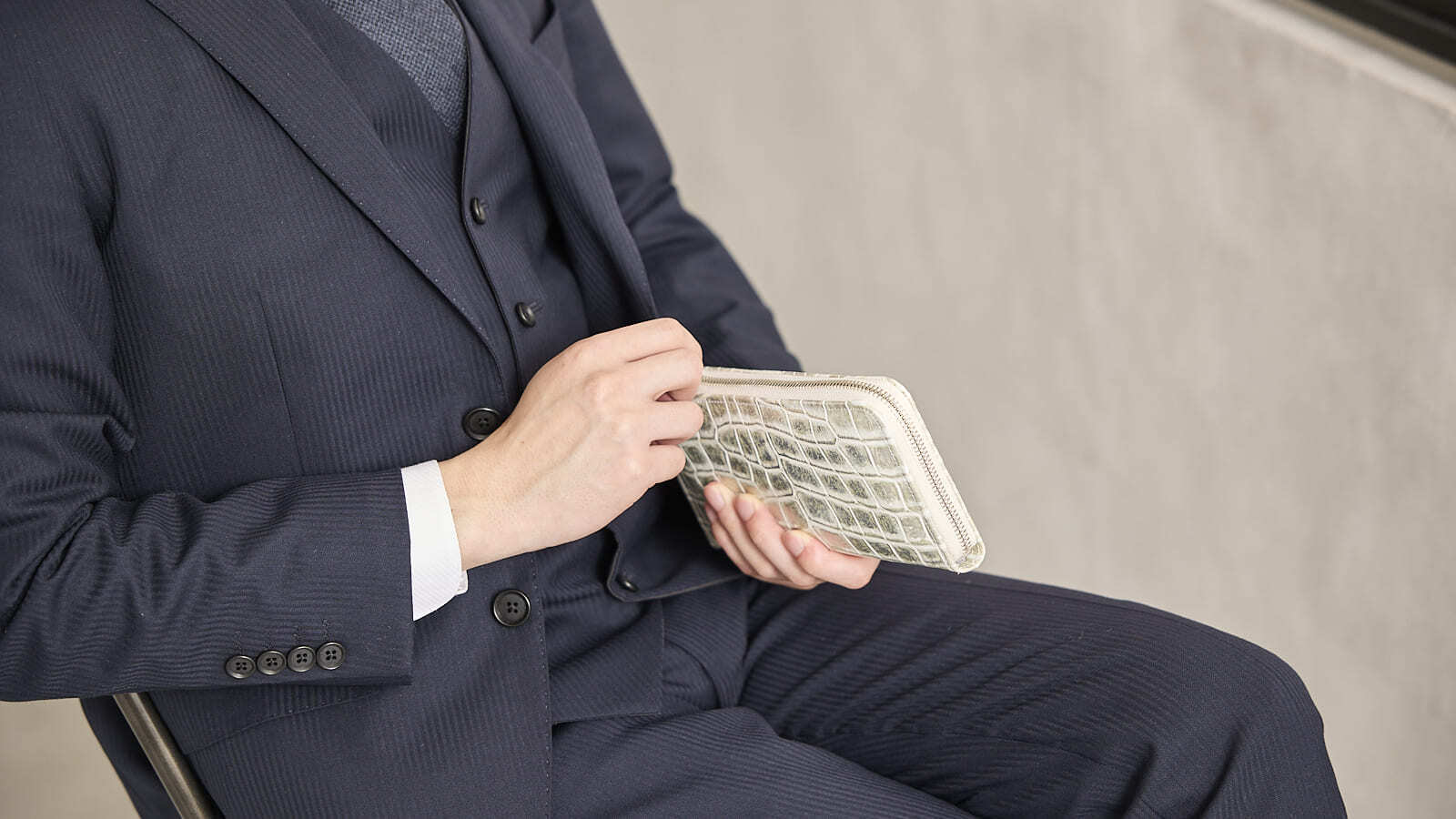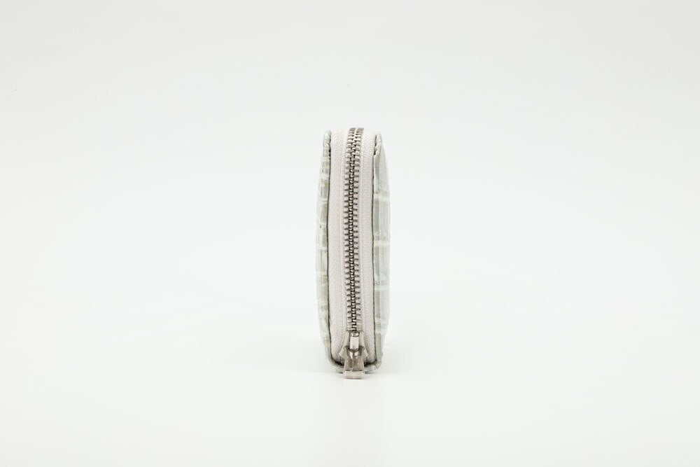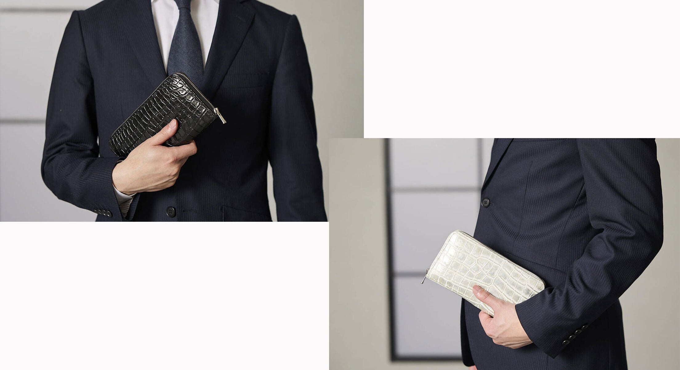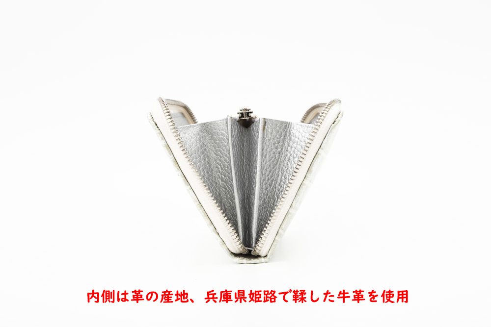 ポロサスクロコダイルの原皮をソフトになるように鞣します。そこから白色(マット仕上げ)に染色し、さらにその上からシルバーを吹きかけます。その後熟練の職人が絶妙なバランスでシルバーを残しながら拭き取り、深みのある表情を作り出しています。この白とシルバーのコントラストは手作業でしか生み出すこのとできない染色の匠によって作り上げられるもはや芸術品といっても過言ではない逸品です。