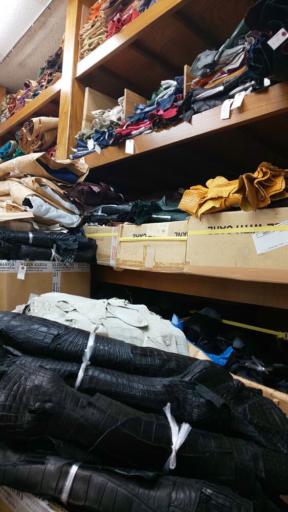 ▶爬虫類革問屋さんの天井まで積み上げられたポロサスクロコダイル革
