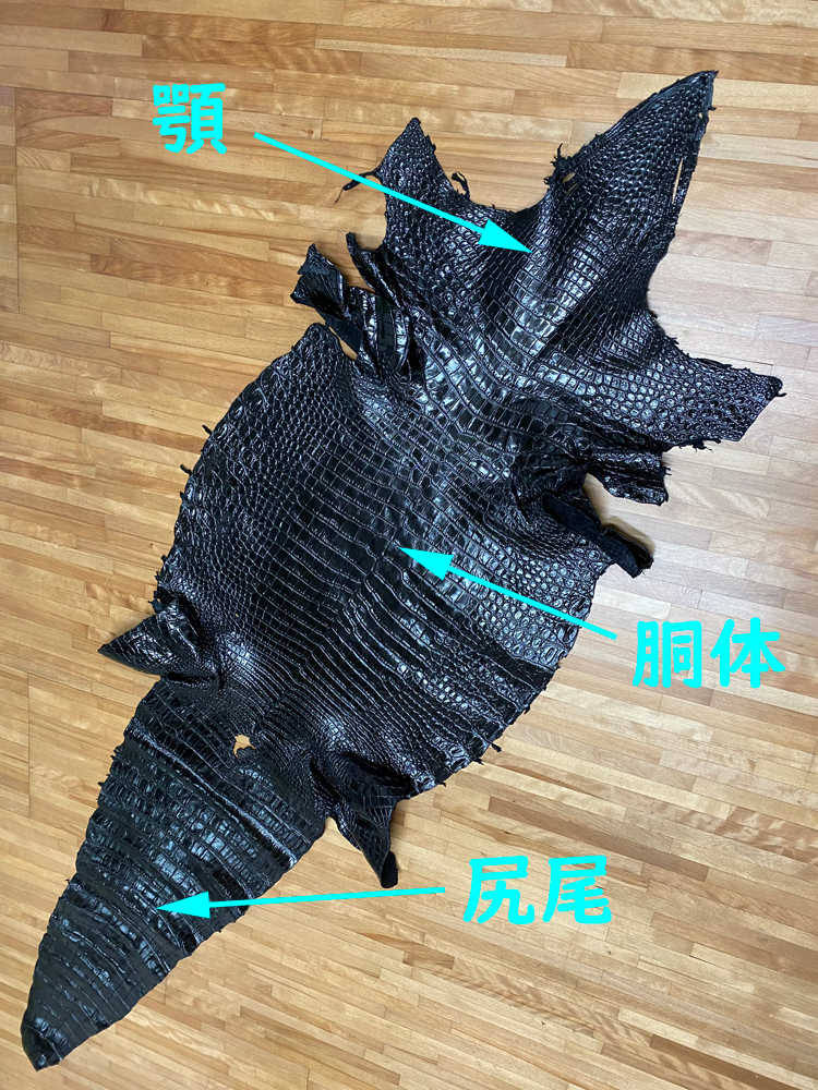 クロコダイル革で一番きれいな場所(鱗が特に綺麗に見える部分をさします)は顎の中央部と胴体で今回のプロジェクトの財布はこの部分のみを使用しております。