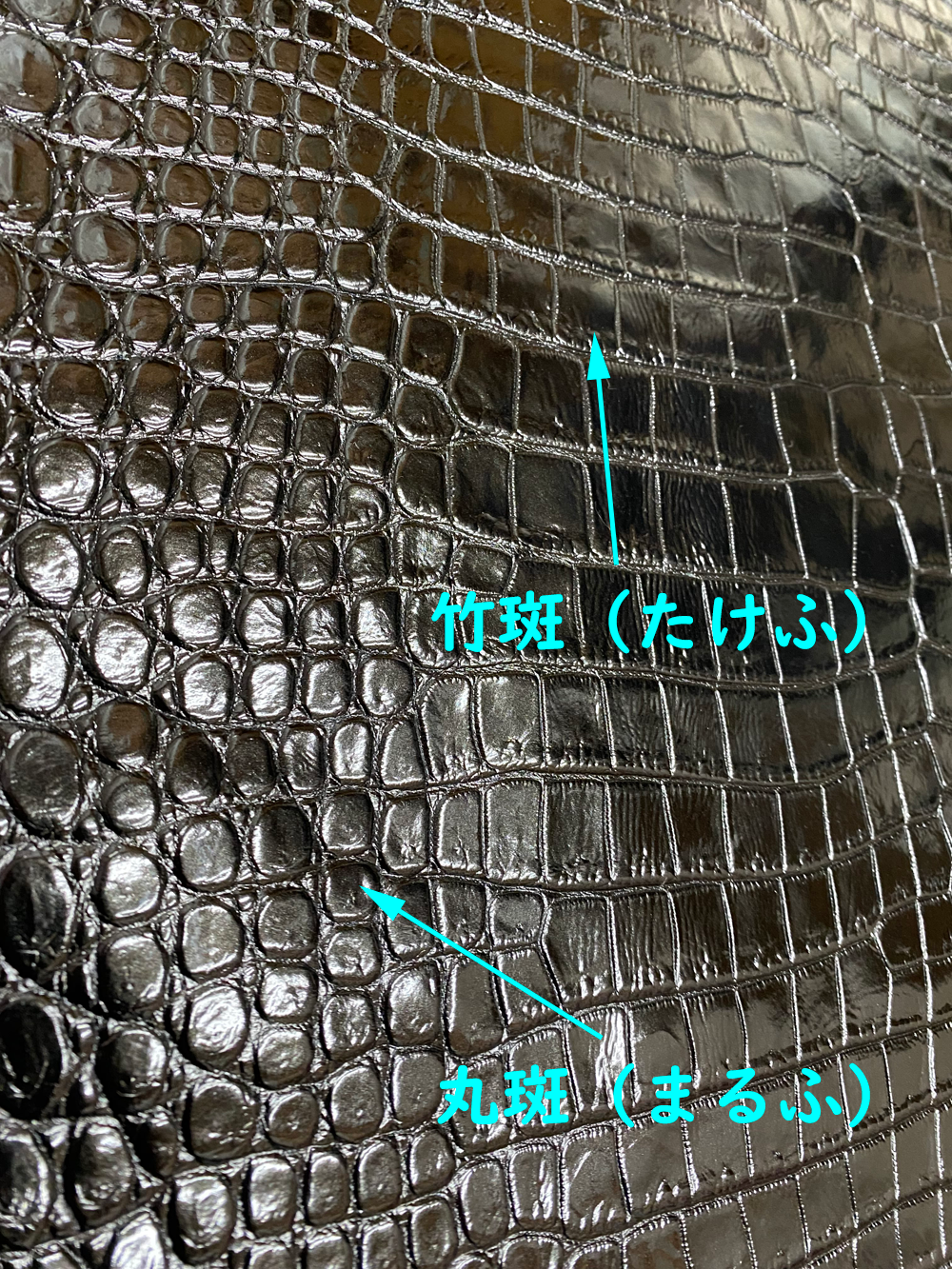 この中でも特に人気のあるのがポロサスクロコダイルで、なんといっても鱗が細かく美麗に揃っていて四角の鱗(竹斑)と両脇の丸い鱗(丸斑)の黄金比といっても過言ではないバランスの良さが特徴です。他のクロコダイル革にはない美しさが人気の秘密です。