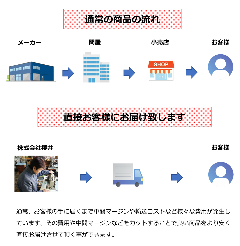 企画/デザイン~製造/お届けなど全ての作業工程を一貫して行っております。直接販売だからこそ、お客様より頂く直接のお声やご要望をすぐに反映させることもできます。