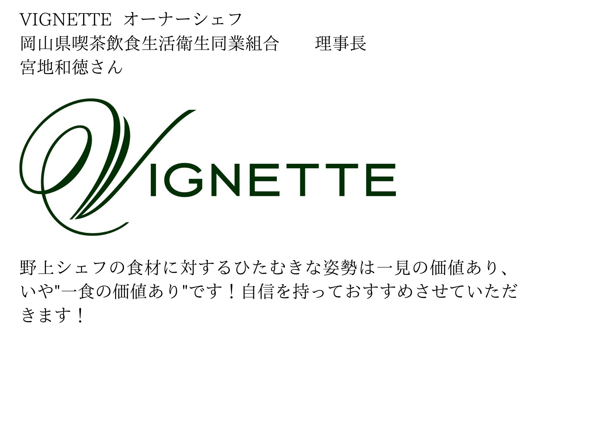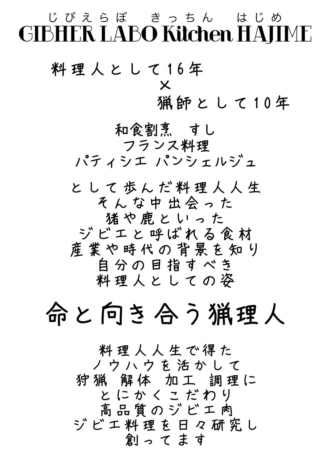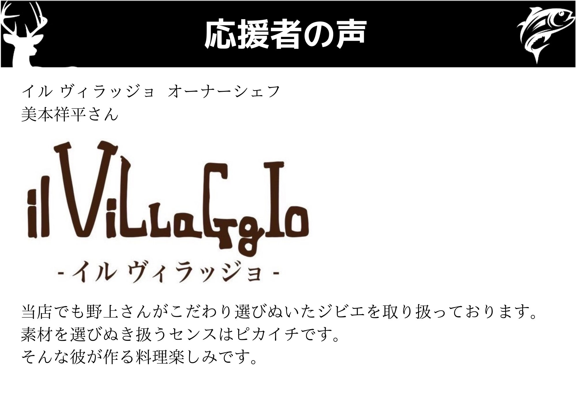 最後にはなりますが、『BISTRO Vie』を通じて、『ジビエ』という素材を活かした、ジビエ料理が本当に美味しいものであり、命の尊さを感じてもらえるものになればそれほど嬉しいことはありません。
