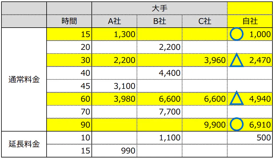△:B社、C社よりも安価なコース→30分、60分コース