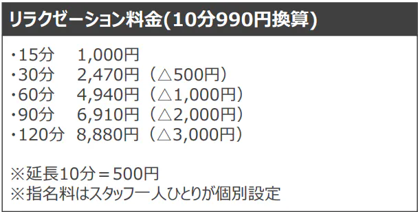 ↓『奥様』がリラクゼーション施術(90分コース=6,910円)※指名の場合は指名料発生