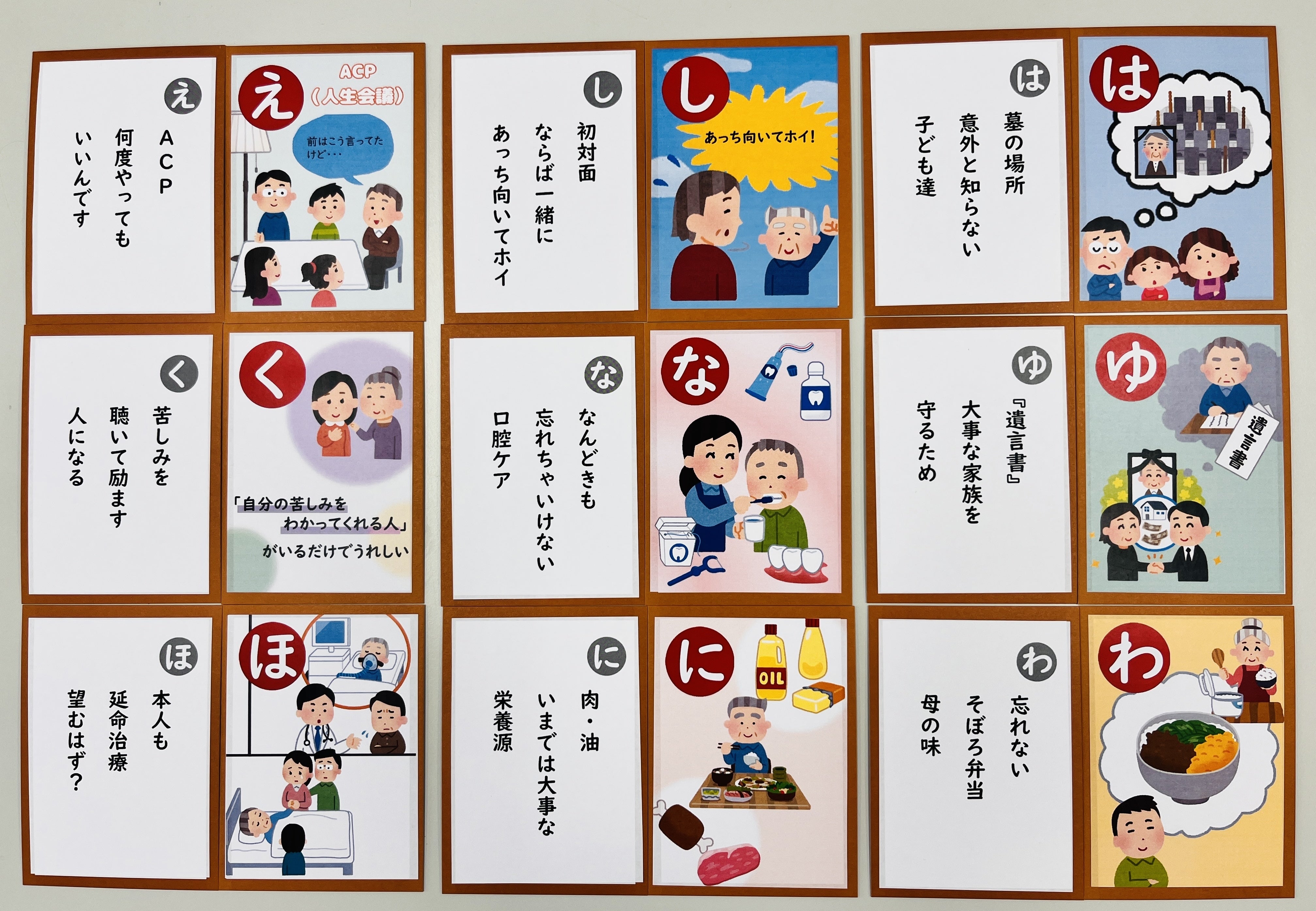また、「あ」から「ん」までの頭文字からはじまる5・7・5の言葉の中に、「健康・栄養・口腔ケア・運動・認知・身体・社会」というあらゆる分野の知識が凝縮されていて、かるたをすることで知識がつき、行動様式まで変えてしまうほどの中味の濃い内容になっています。実際、このことをきっかけにかるたに教えて頂いたことを日々の生活の中に取り入れておられる方も多くおられます。私達は日頃のお仕事の中でも活用させて頂いていまして、フレイルや認知症の予防だけでなく、進行の抑制にも効果があると思っています。その第2弾のカルタができて、さらに多くの示唆に富んだ内容の川柳が、このかるたを利用する方々にいろいろな事を教えてくれています。また、今とても重要なACPを取り入れて、わかりやすい言葉で「自分の人生の終末のことを今から考えて行動していきましょう」ということを教えて頂けることは、このかるたを通じて今後の人生を更に豊かにしていくことができると思います。より多くの方々がこのかるたを活用されて、寿命を全うする日まで、健やかで豊かな日々を過ごすことができたらいいなぁと強く願っております。