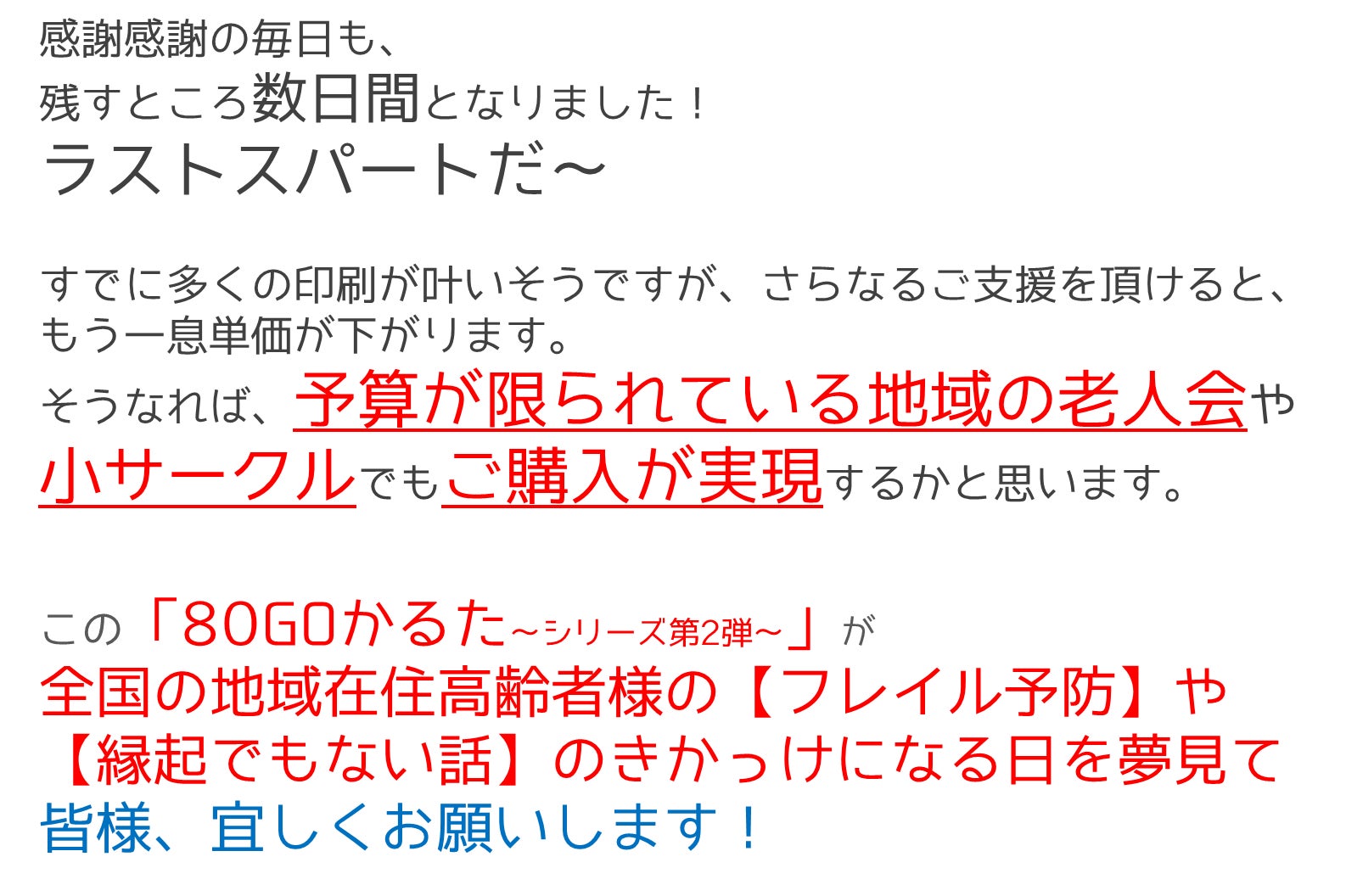 2026/04/03 07:38皆様 長らくお待たせいたしました!昨晩、残りのリターン分を発送完了(手渡しの方を除く)いたしました!共同制作した大切な仲間たちとともに、気持ちを込めてツメツメし、ようやく発送できました(涙)さあこれからは、このかるた活用して、フレイル予防&人生会議を各地域に拡げていく!ご支援いただきました皆様の真心を、地域の活力に変えていく!ただ、私たちだけではそれは不可能です。皆様おひとりおひとりのお力が必要です。まずは、やってみてください。そして遊び方を発展させてください。どんどんSNS発信もお願いします。皆さんとともに育てていければ幸いです。井尻吉信 もっと見る