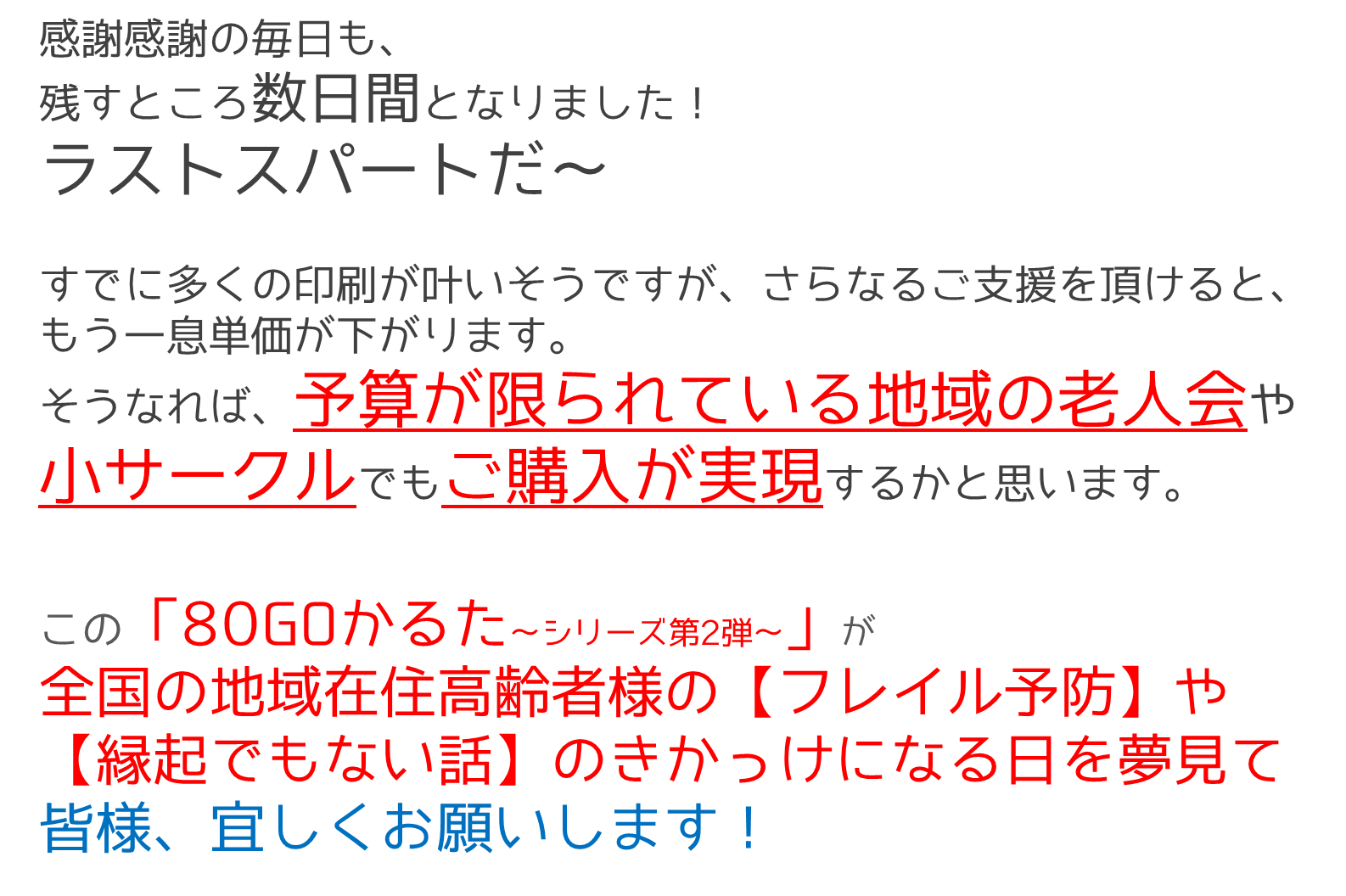 2026/04/03 07:38皆様 長らくお待たせいたしました!昨晩、残りのリターン分を発送完了(手渡しの方を除く)いたしました!共同制作した大切な仲間たちとともに、気持ちを込めてツメツメし、ようやく発送できました(涙)さあこれからは、このかるた活用して、フレイル予防&人生会議を各地域に拡げていく!ご支援いただきました皆様の真心を、地域の活力に変えていく!ただ、私たちだけではそれは不可能です。皆様おひとりおひとりのお力が必要です。まずは、やってみてください。そして遊び方を発展させてください。どんどんSNS発信もお願いします。皆さんとともに育てていければ幸いです。井尻吉信 もっと見る