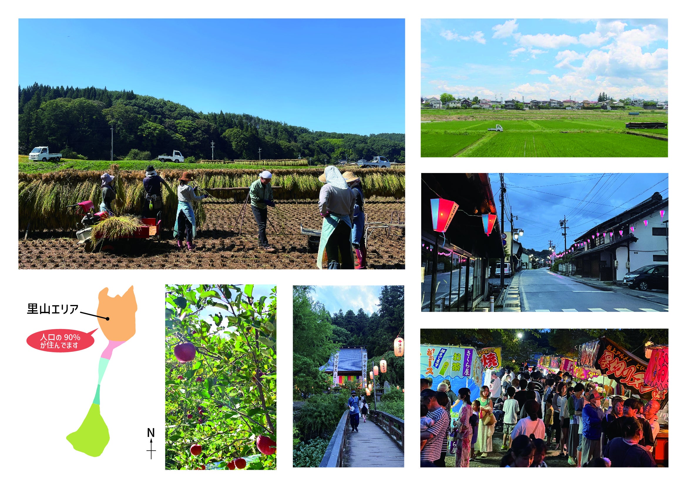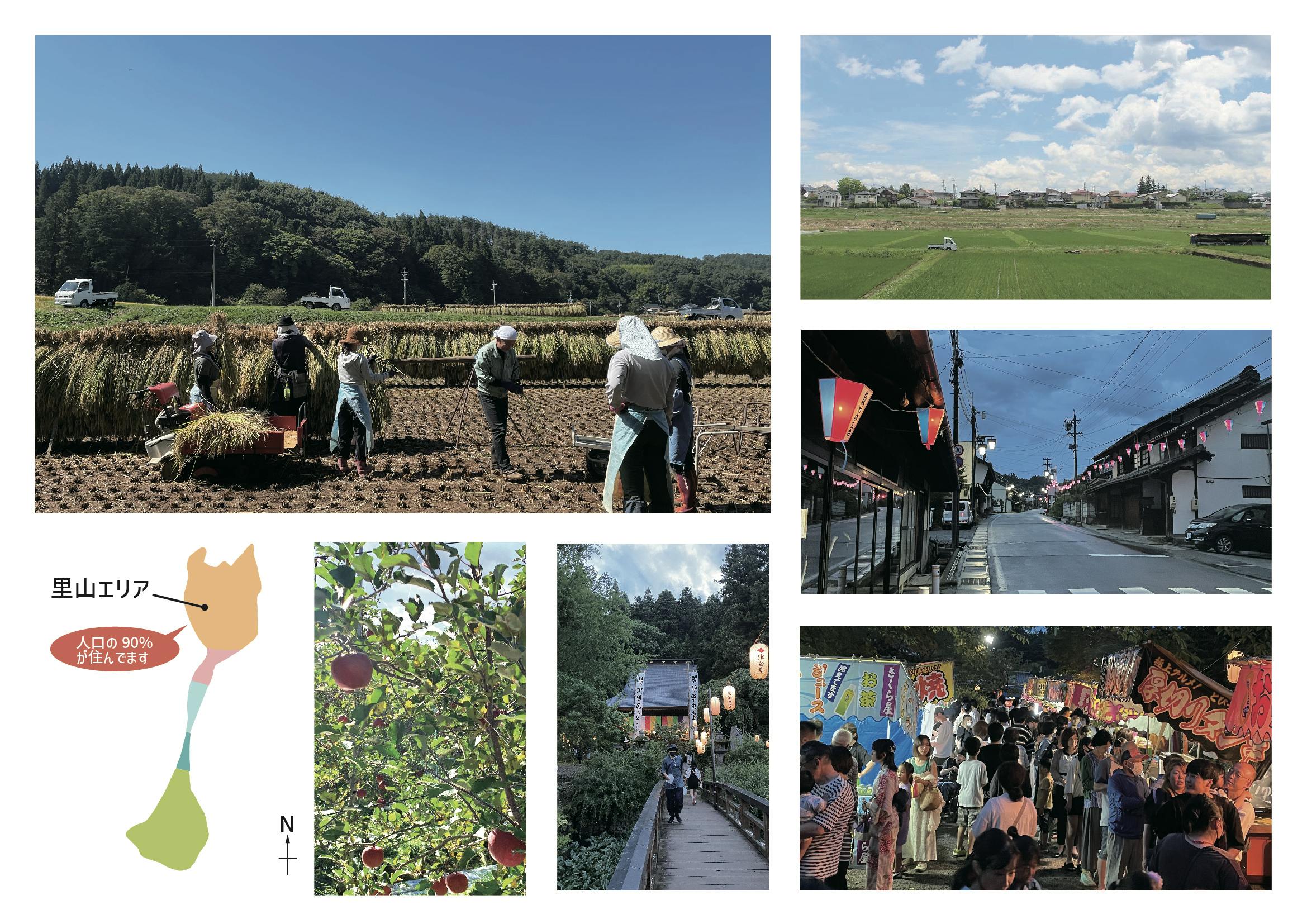 南北に細長い形もそれぞれ特徴があって、地域の人たちが主に暮らしているの北側の里山エリアと呼ばれている地域では、のどかな田園風景や中山道沿いの歴史的な町並みが残っています。標高710mほどの場所で、晴天率も高いため、年間を通して気持ちのよい気候が続きます。特産のリンゴやお米、採れたての季節の野菜もたくさんあって食べるものにも困ることはありません。