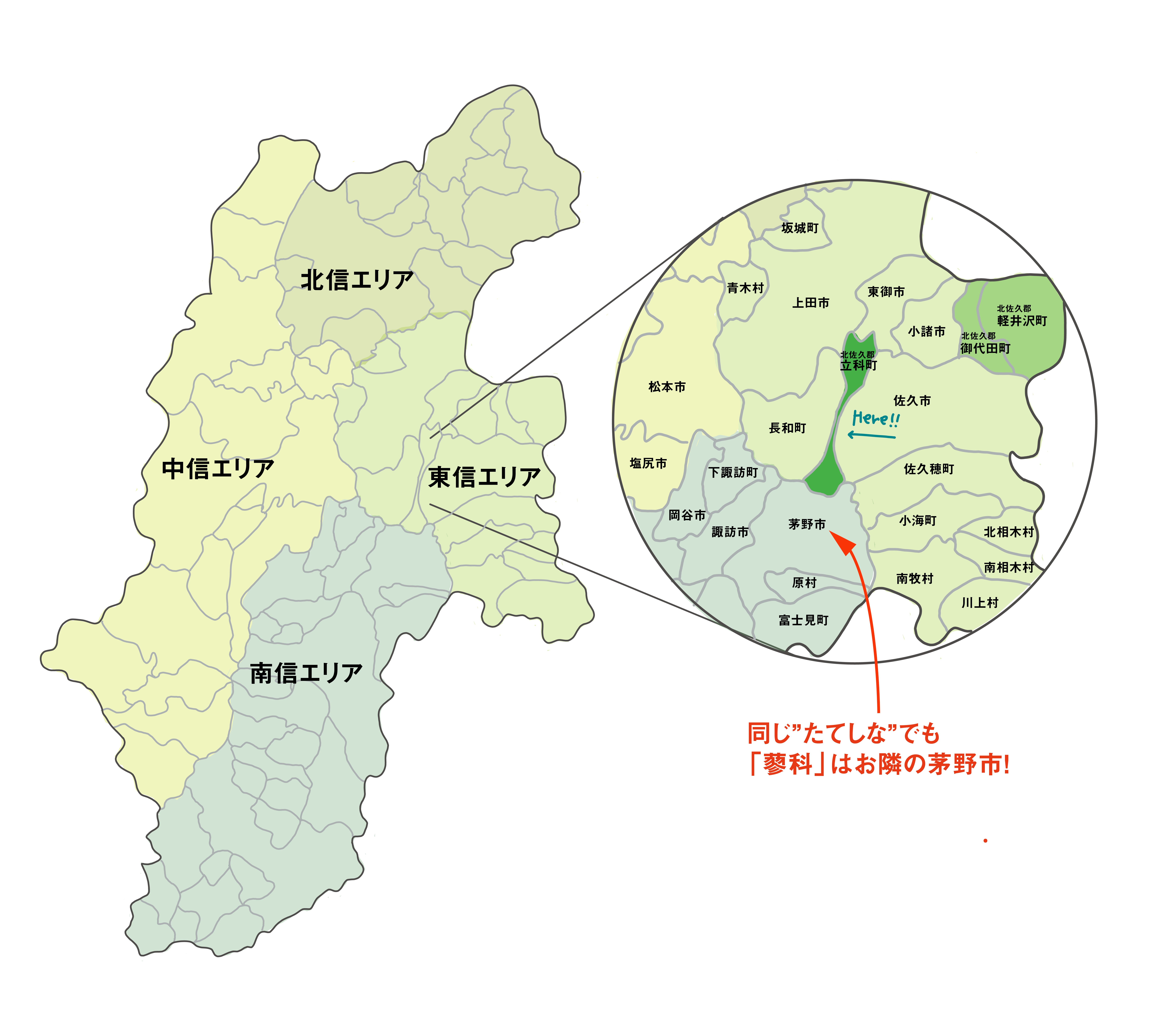 佐久市や上田市、小諸市、東御市、茅野市などの大きな市に囲まれており、SNSや雑誌などでもよく、「佐久、上田行ってきた!」といった投稿や「軽井沢、御代田特集」といった記事をよく見ます。ワイナリーで有名な東御市や移住で人気の小諸市など、魅力的な地域が周りたくさん囲まれながら、真ん中にある「立科町」だけは、ほとんど話題にならないのです。。。 「たてしな」の名前が出ても、それは先ほどご紹介した茅野市の「蓼科」の場合が大半なのです。