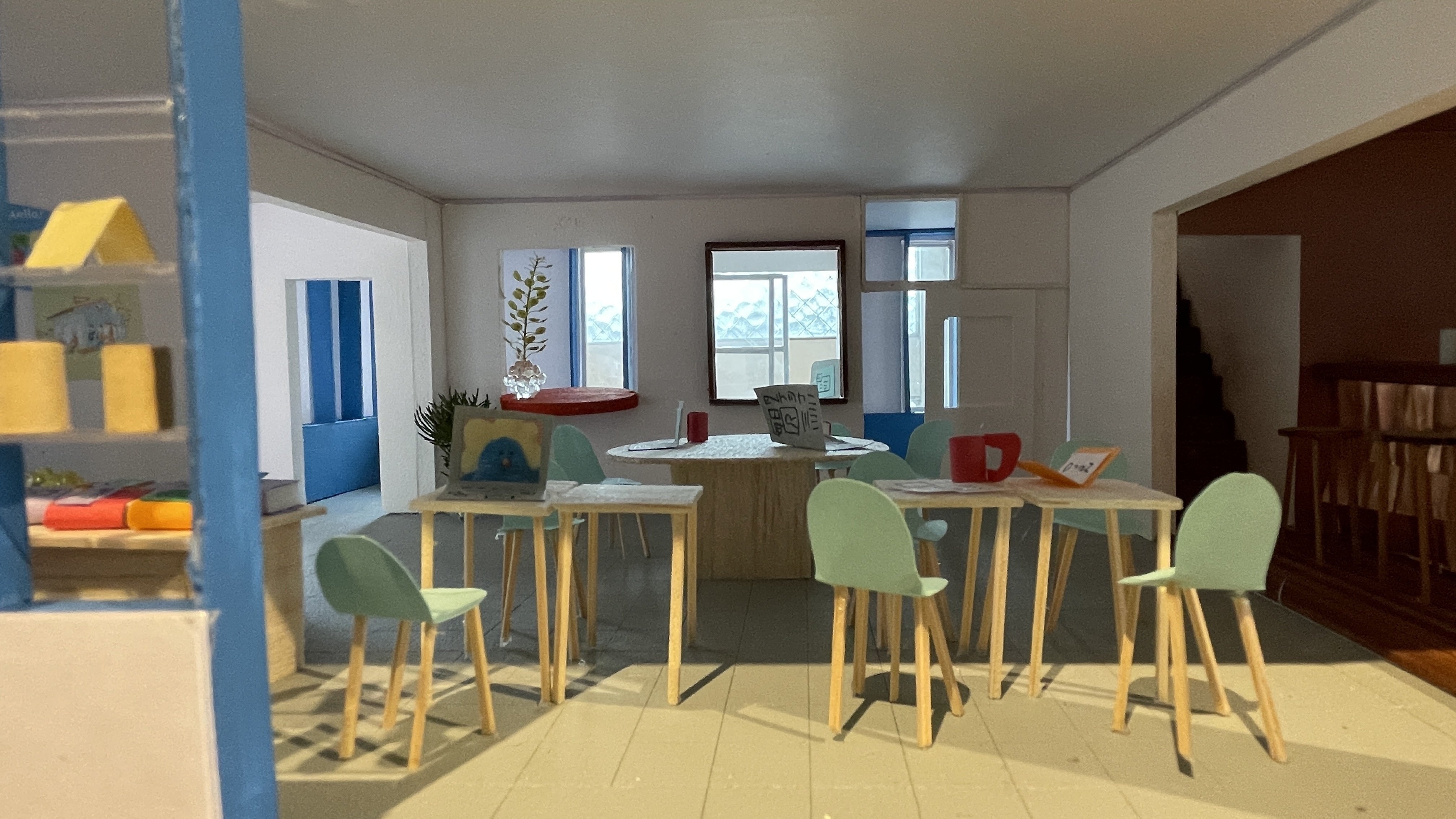アツマルセンターは町かどオフィスの隣にある2階建ての建物で、1階と2階にそれぞれ別々の機能があります。