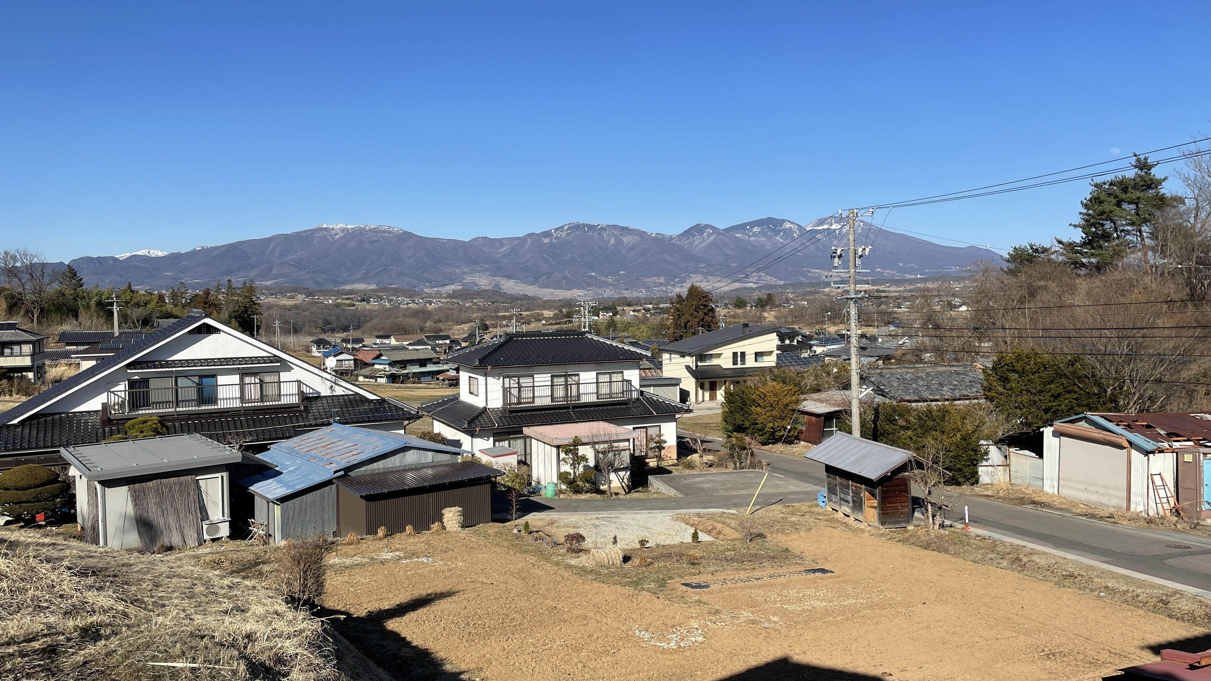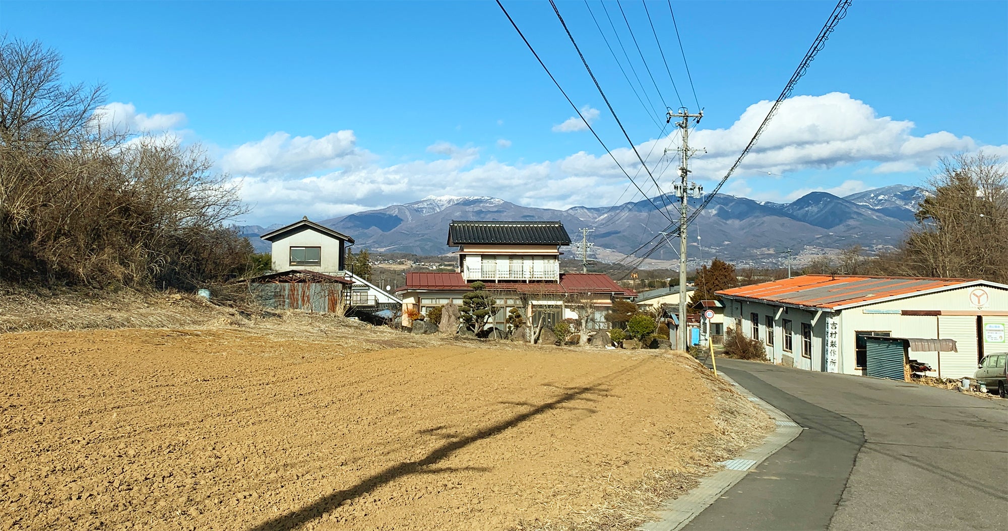 手前には広大な畑と、奥には浅間山を望むのどかな土地に建つ住宅(中央)と離れの小屋(左側)最近まで大家さんによってお手入れされていたため状態が良かった