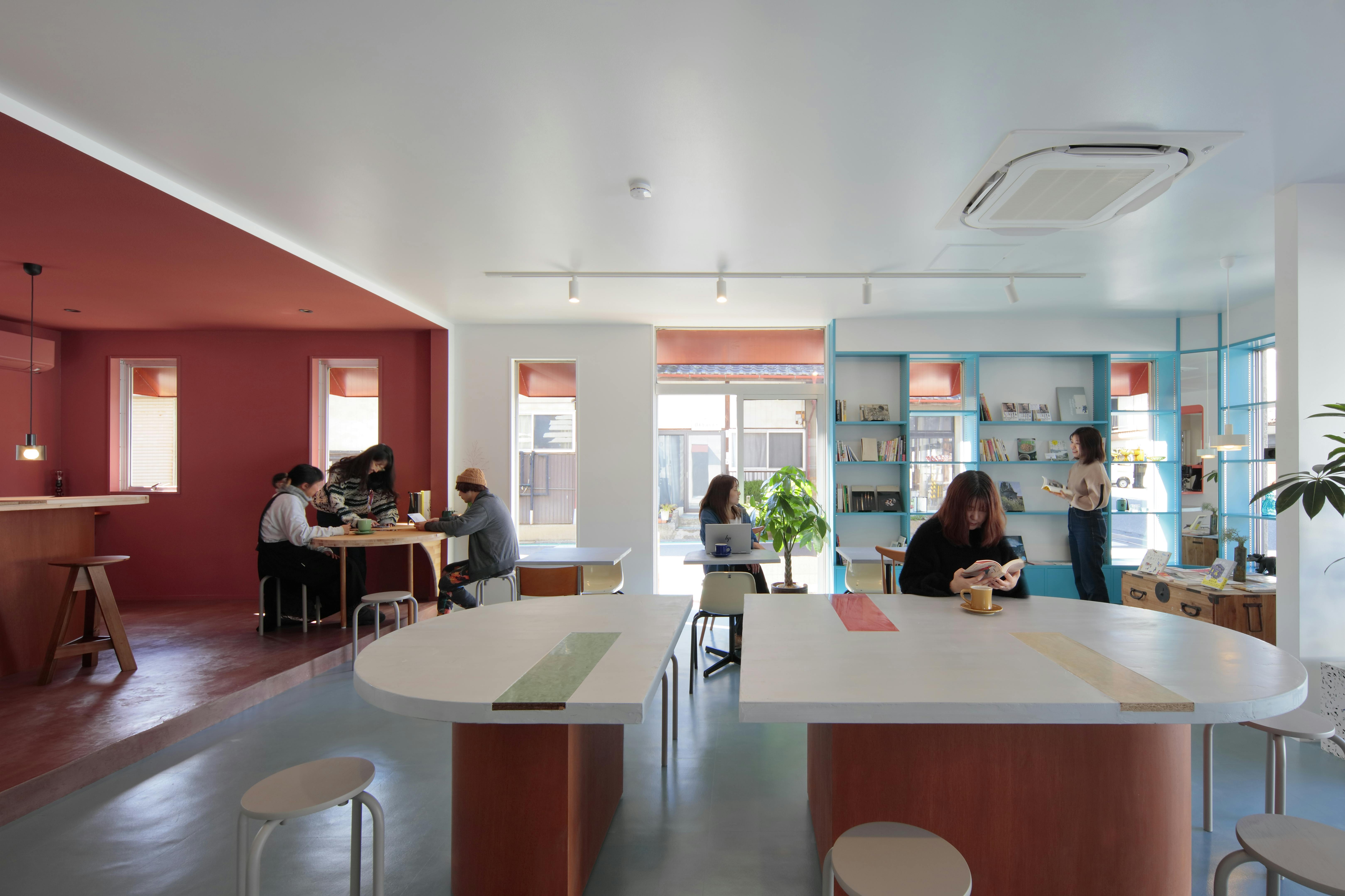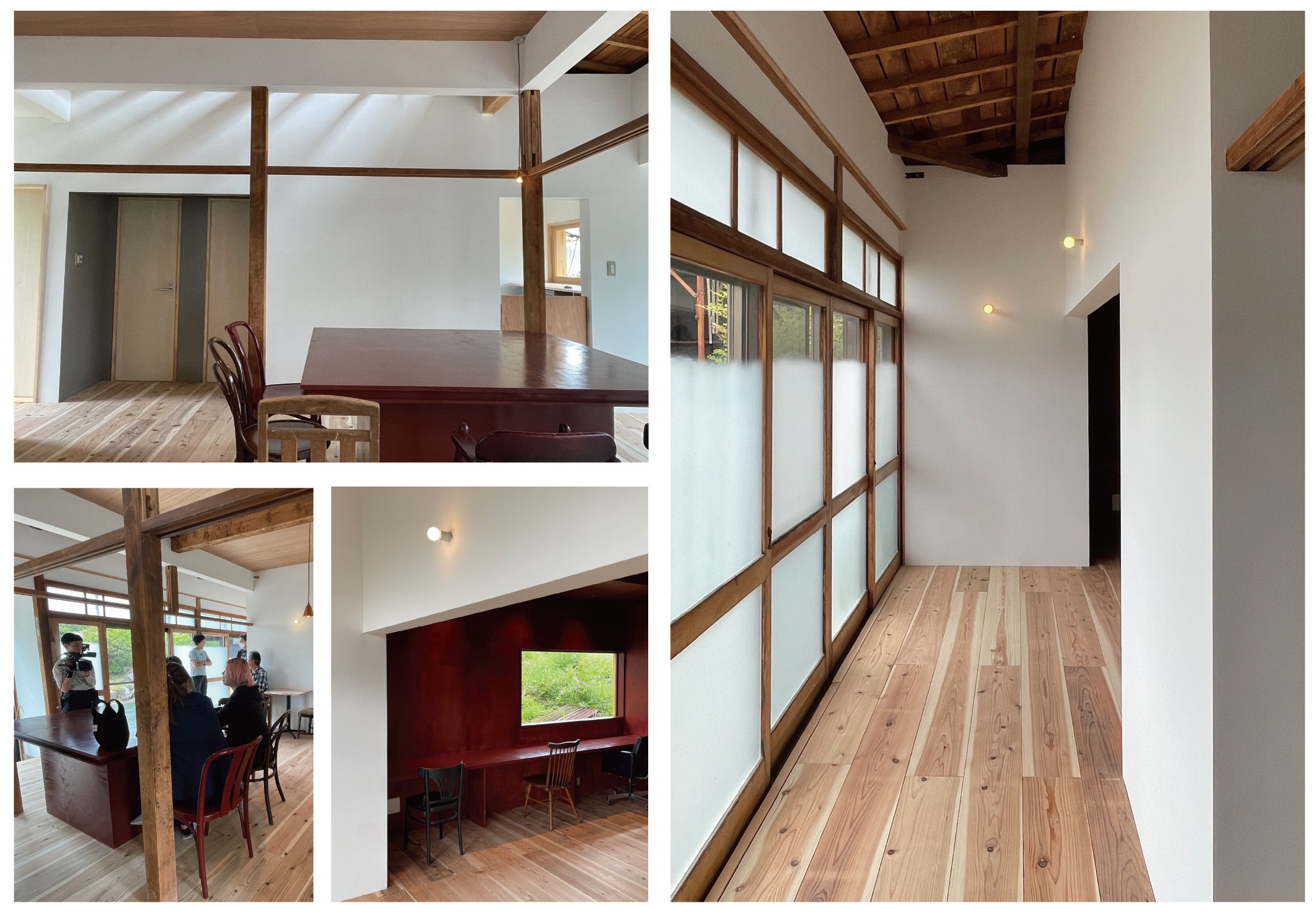 改修の計画は1階にカフェ用の厨房と、耐震上の都合で追加した耐力壁によって仕切られた2つの客席スペース、宿泊者用のミニキッチンとシャワールームを作ります。こちらのカフェスペースは先行して内装は完成、運転の準備を進めているところです。