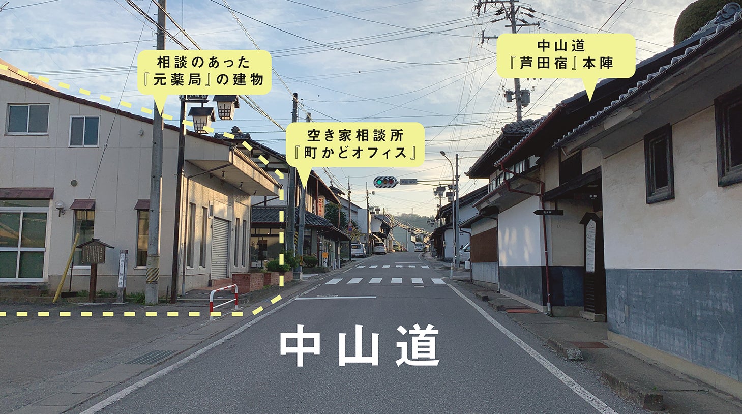 このプロジェクトのきっかけは、建物所有者さんから「うまく活用出来る人に繋げていけないか」という相談をもらったのが最初でした。中山道沿いの交差点に建つ「大島薬局」という白い建物で、隣には空き家相談所の「町かどオフィス」、正面には、県宝にもなっている「中山道芦田宿本陣」があります。すぐに利用者が見つかりそうな建物でしたが、なかなかマッチングまで繋がりませんでした。