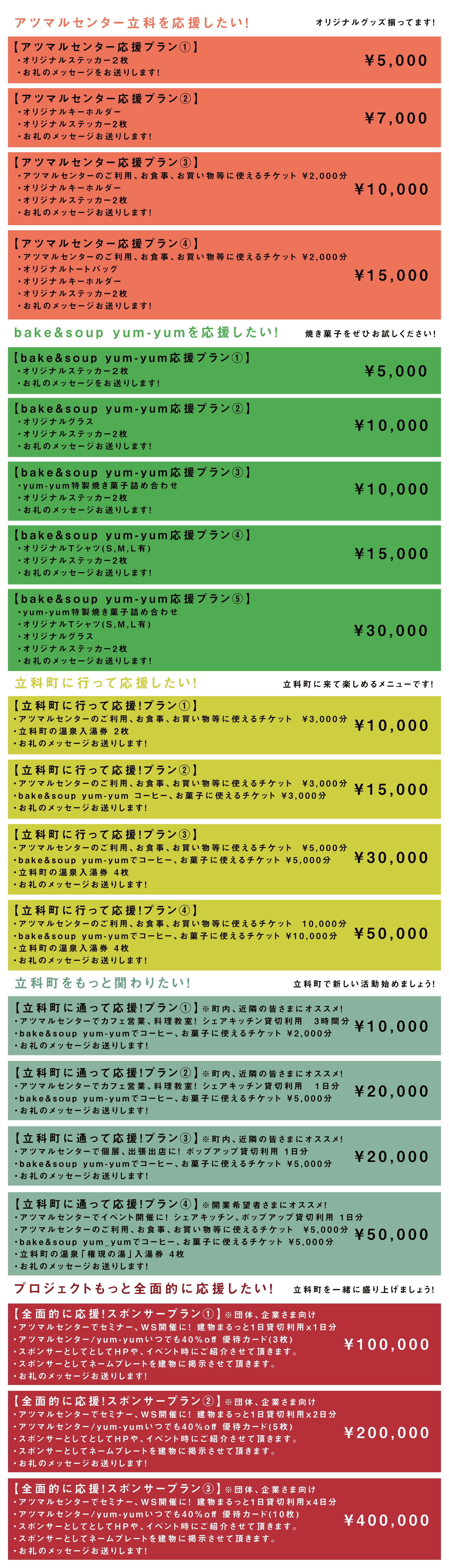 2024/09/18 00:56皆さんこんにちは! 早いものでクラウドファンディングも残すところあと12日となりました。すでにご支援頂いてる方も、これからご検討の方もありがとうございます!今回、リターン品を複数ご用意させて頂きましたので、リターン品をどれにしようかとお悩みの方もいらっしゃるかと思います。そこで今回はオリジナルグッズの紹介をしていきたいと思います!1: アツマルセンターオリジナルステッカーTOP画像のステッカーはアツマルセンターオリジナルのステッカーになります。今回、建物のパースとイラストを、運営メンバーでアツマルセンターの副館長となる千代田彩華さんに描いてもらいました。アツマルセンター副館長になる千代田さん 似顔絵を描くワークショップなども行ってます◆ステッカー対象プラン:【アツマルセンター応援プラン】全てに付いてくる返礼品となっています。2: アツマルセンターオリジナルキーホルダーオリジナルのキーホルダーはクリアマルチケース型で、アツマルセンターのイラストが描かれています。名刺サイズにピッタリなので、名刺入れや鍵、化粧小物なども収納出来ます。素材: PVC(厚さ 0.8mm)手のひらサイズで使い方は様々。◆キーホルダー対象プラン:下記3つのプランに付いてくる返礼品となります。【アツマルセンター応援プラン②】¥7,000その他、オリジナルステッカー2枚/お礼のメッセージ をお送りします!【アツマルセンター応援プラン③】¥10,000その他、オリジナルステッカー2枚/アツマルセンターのご利用、お食事、お買い物等に使えるチケット ¥2,000分/お礼のメッセージ をお送りします!【アツマルセンター応援プラン④】¥15,000その他、オリジナルステッカー2枚/オリジナルトートバッグ/アツマルセンターのご利用、お食事、お買い物等に使えるチケット ¥2,000分/お礼のメッセージ をお送りします!3: アツマルセンターオリジナルトートバッグ「アツマレ!」と大きく描かれたトートバッグです。高さ40cm 幅48cmの大容量サイズ(19Lほど)となっています。素材: 綿100%大容量で荷物もたくさん入ります◆トートバッグ対象プラン:下記のプランに付いてくる返礼品となります。【アツマルセンター応援プラン④】¥15,000その他、オリジナルステッカー2枚/オリジナルキーホルダー/アツマルセンターのご利用、お食事、お買い物等に使えるチケット ¥2,000分/お礼のメッセージ をお送りします!4: bake&soup "yum-yum" オリジナルステッカーお店のロゴが入ったステッカーを2種類ご用意しました!◆ステッカー対象プラン:【bake&soup "yum-yum" 応援プラン】全てに付いてくる返礼品となっています。5: bake&soup "yum-yum" オリジナルロンググラスお店のロゴが入ったロンググラスはこのような形のものになります!サイズ:直径×高さ 76mm×151mmお店のロゴとイラストが印字されてます◆グラス対象プラン:下記のプランに付いてくる返礼品となります。【bake&soup yum-yum応援プラン!②】¥10,000その他、オリジナルステッカー2枚/お礼のメッセージ をお送りします!【bake&soup yum-yum応援プラン!⑤】¥30,000その他、オリジナルステッカー2枚/オリジナルTシャツ/特製焼き菓子詰め合わせ(15個程度)/お礼のメッセージ をお送りします!6: bake&soup "yum-yum" オリジナルTシャツお店のロゴがフロントにプリントされた、白いTシャツとなります。サイズ:S/M/L (Lより大きいサイズが欲しい方は個別にご連絡くださいませ)カラー:白Lサイズ着用。サイズは個別にご連絡します◆Tシャツ対象プラン:下記のプランに付いてくる返礼品となります。【bake&soup yum-yum応援プラン!④】¥15,000その他、オリジナルステッカー2枚/お礼のメッセージ をお送りします!【bake&soup yum-yum応援プラン!⑤】¥30,000その他、オリジナルステッカー2枚/オリジナルロンググラス/特製焼き菓子詰め合わせ(15個程度)/お礼のメッセージ をお送りします!いずれもここでしか手に入らないオリジナルグッズとなりますので、ぜひご検討ください! もっと見る