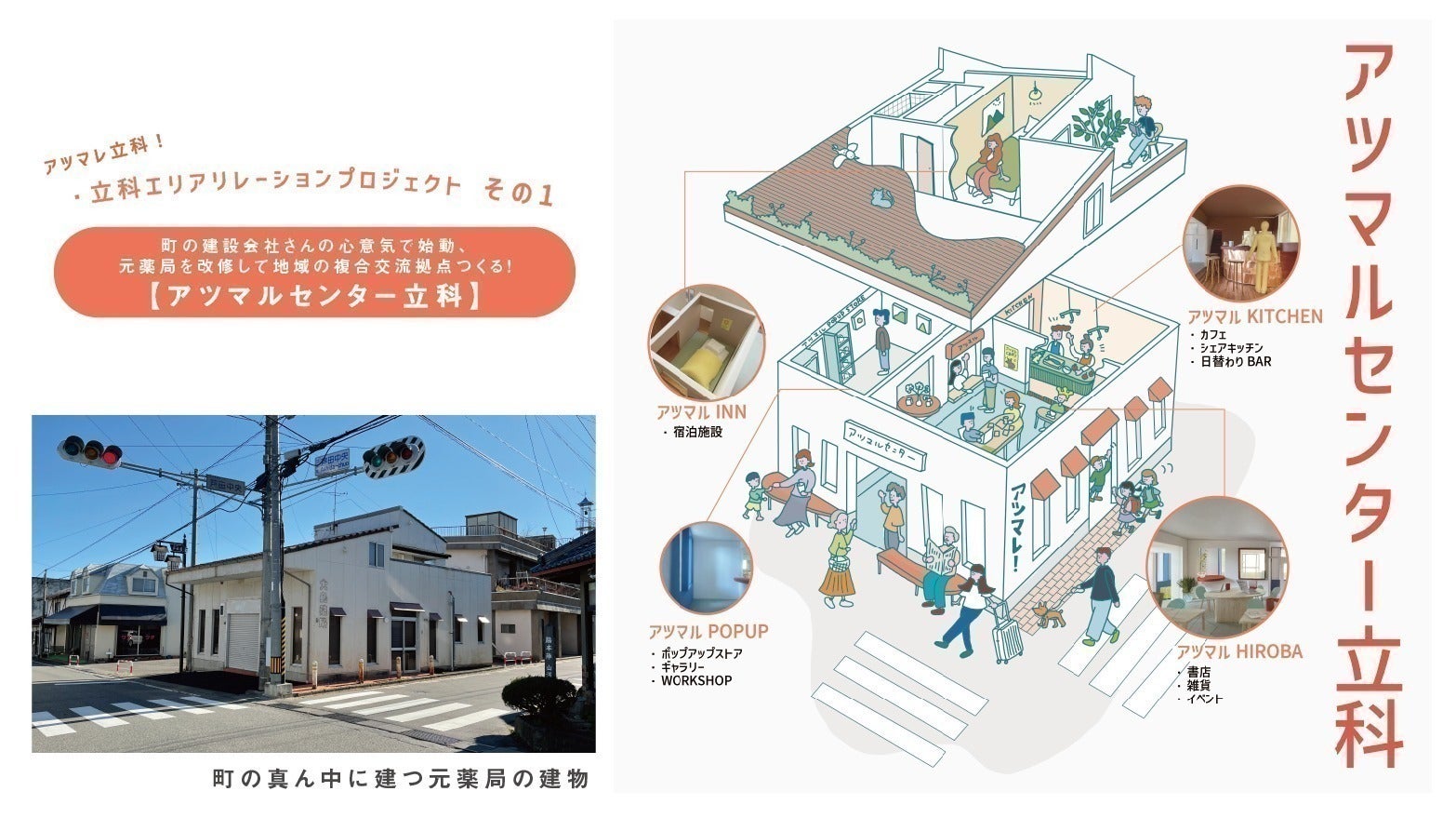 一つ目のプロジェクトは「町かどオフィス」の道向かいにある元薬局の建物を改修して作る複合交流拠点、「アツマルセンター立科」。