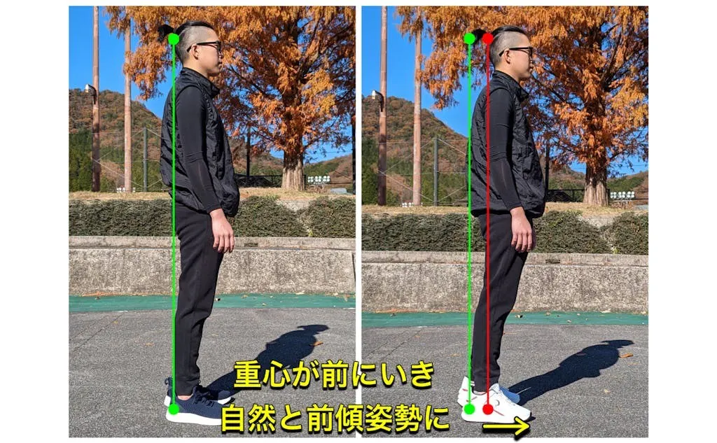 履いているだけで身体が前傾になり、走行中もスムーズに重心移動ができるようになります。