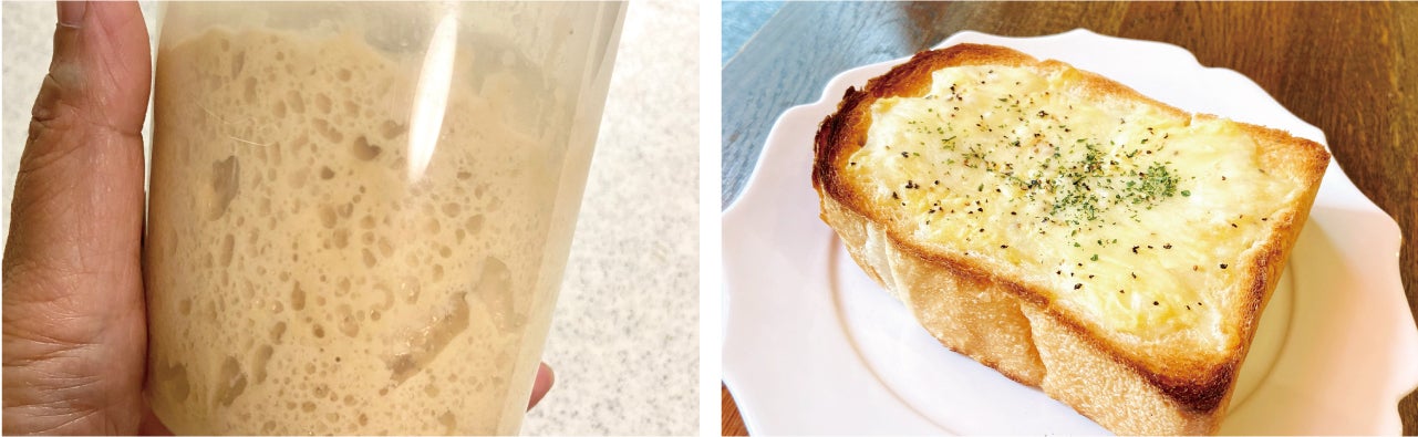 自家製の天然酵母の種と、それを使って焼いたパンのチーズトースト。