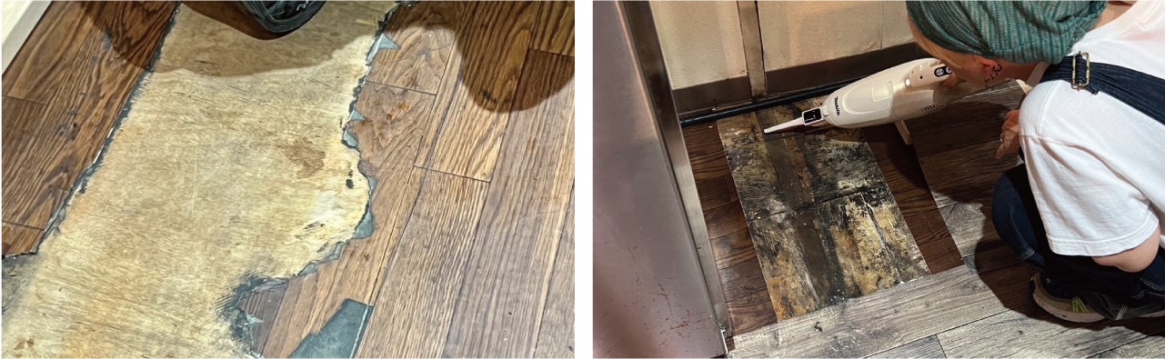 剥がれた部分も多く、カビもひどかった床。