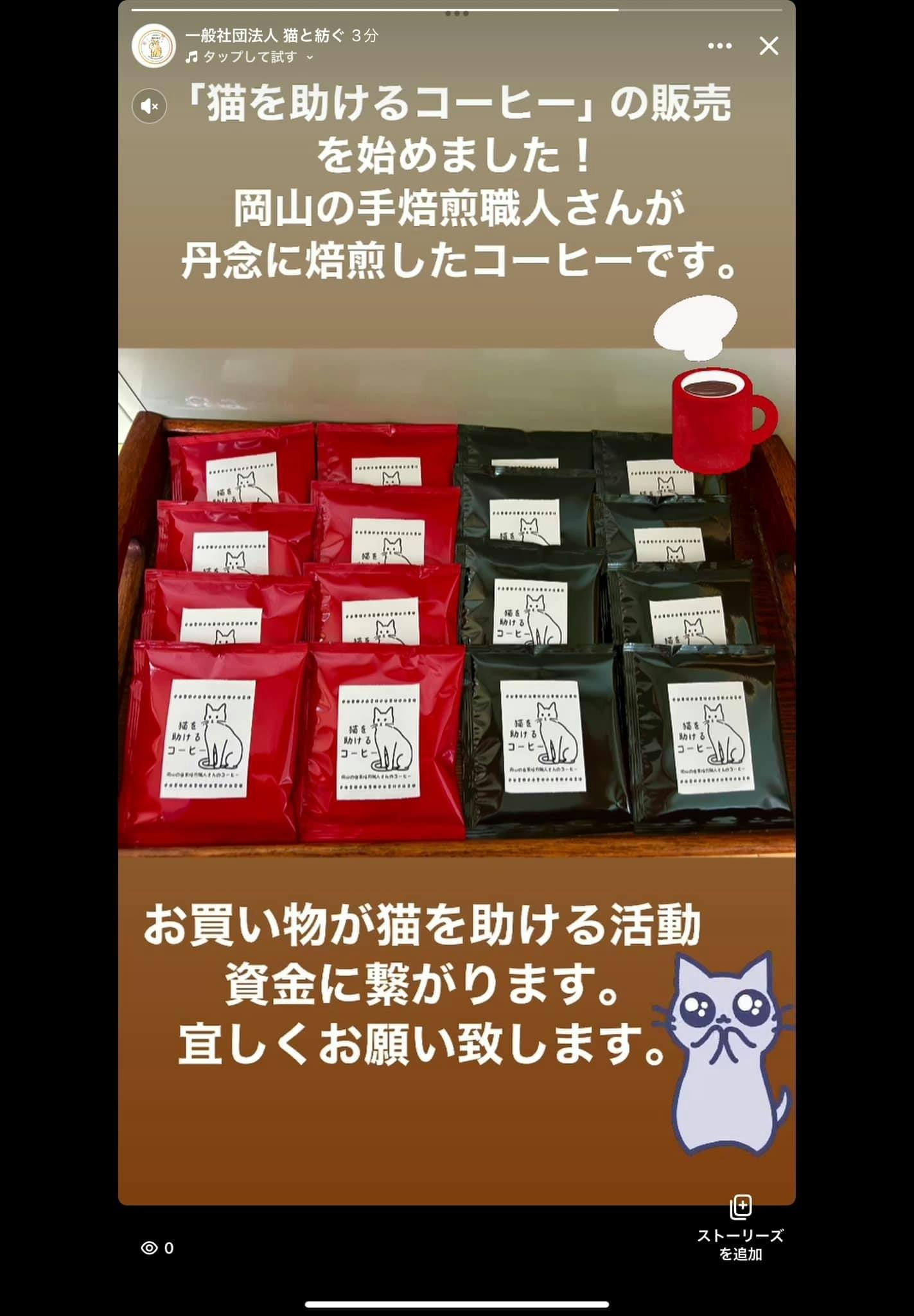 猫を助けるコーヒー岡山の手焙煎職人さんが丹念に焙煎したコーヒーです。