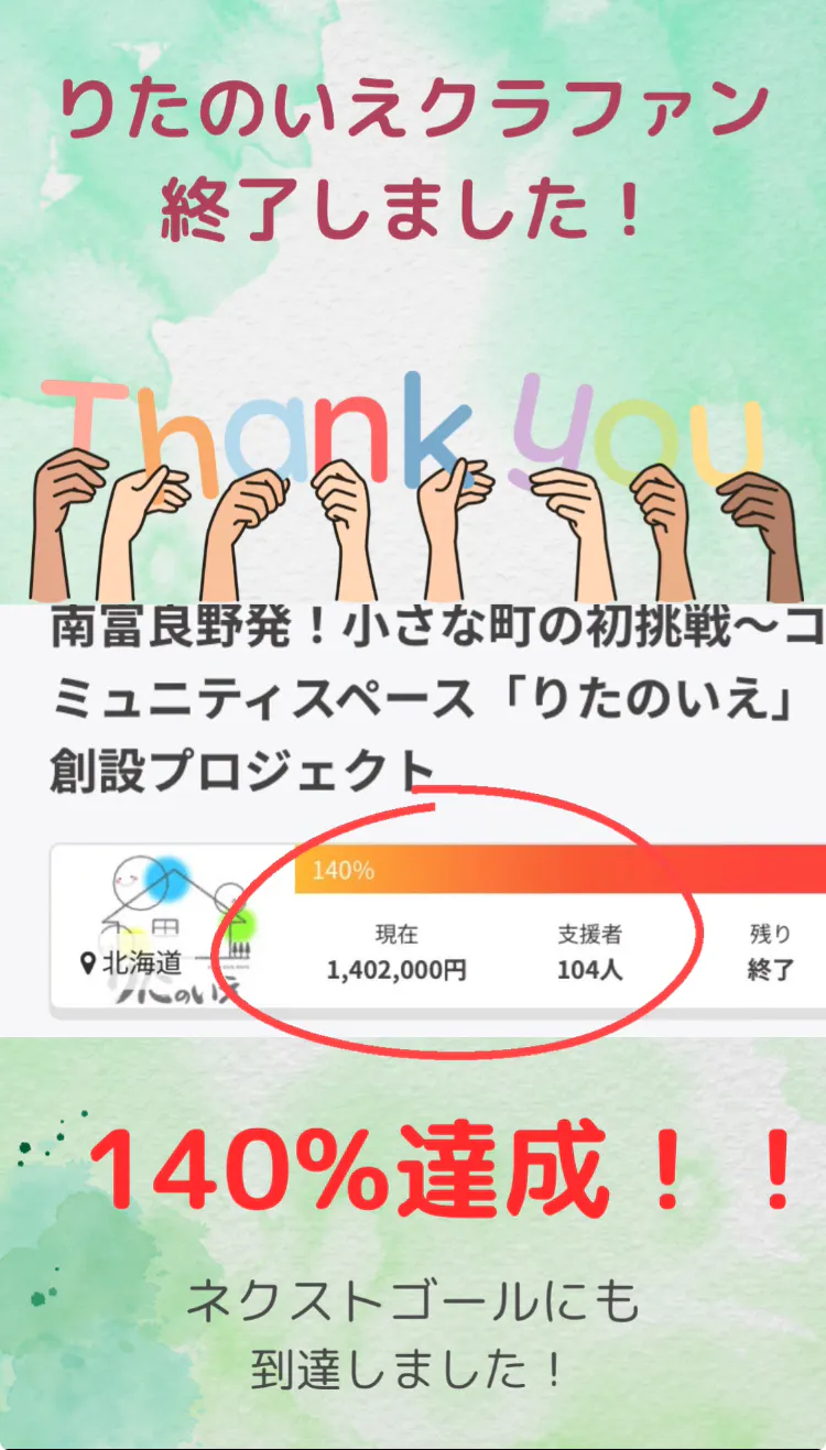 2024/10/01 19:00「南富良野町にコミュニティスペースを作りたい‼」と、8月22日からスタートした「りたのいえ」クラファン。支援総額 140万2,000円支援者数 104名達成率140%にて成功し昨日23時59分、無事終了しました‼たくさんのご支援、本当にありがとうございました!初めてだらけの40日間のチャレンジを完走出来たのは、皆さまからの温かい応援があったからです。感謝してもしきれません。とはいえ、りたのいえはやっとスタートラインに立ったばかり。これからが本番!チーム一同気を引き締めて頑張ります!引き続きどうぞ宜しくお願いします!まずは取り急ぎ御礼でした^^※リターン返送は11月以後、順次おこなって参りますので、しばらくお待ち下さいませ。また、返送や準備に連絡が必要な場合は、個別にメッセージさせて頂きます。宜しくお願い致します! もっと見る