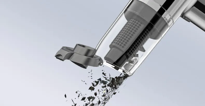 コンパクトなハンディクリーナーには、こまめなゴミ捨てが必要です。ボタン一つで簡単にゴミ捨てができる手を汚さないダストボックス設計で、吸引力を保ちます。
