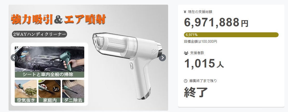 2024/11/01 09:17皆さま、おはようございます。この度は「いつでも愛車や家を美しく!吸引も噴射もこれ一台で!2WAYミニ掃除機OUNAIⅢ」にご支援頂き誠にありがとうございます!この度、たくさんのご支援をいただき誠にありがとうございました!!無事に終了いたしました。ご協力いただきました皆さま、本当にありがとうございます。1日も早く、皆様の元に商品をお届けできますよう準備を進めてまいります。引き続きどうぞよろしくお願いいたします。 もっと見る