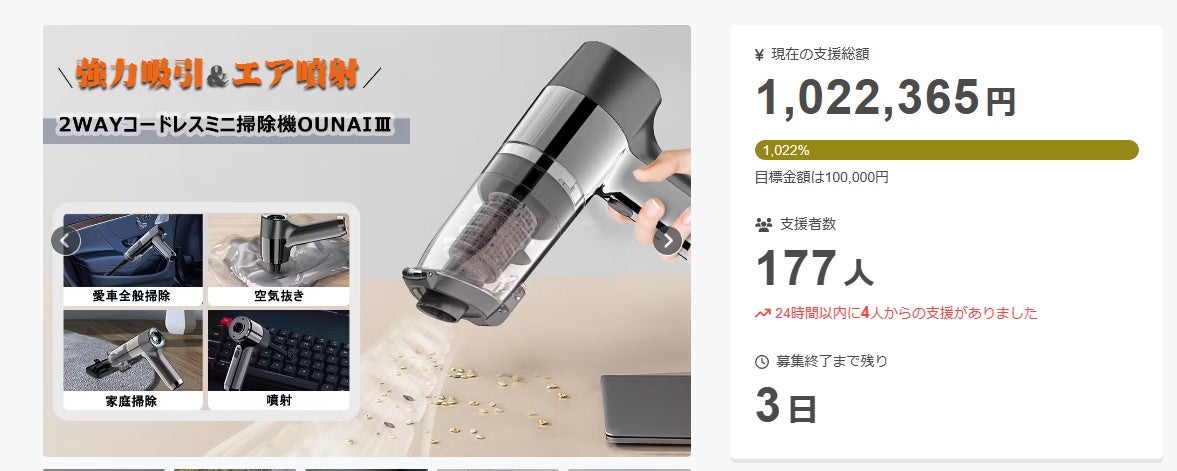 この度は「いつでも愛車や家を美しく!吸引も噴射もこれ一台で!2WAYミニ掃除機OUNAIⅢ 」にご支援頂き誠にありがとうございます!