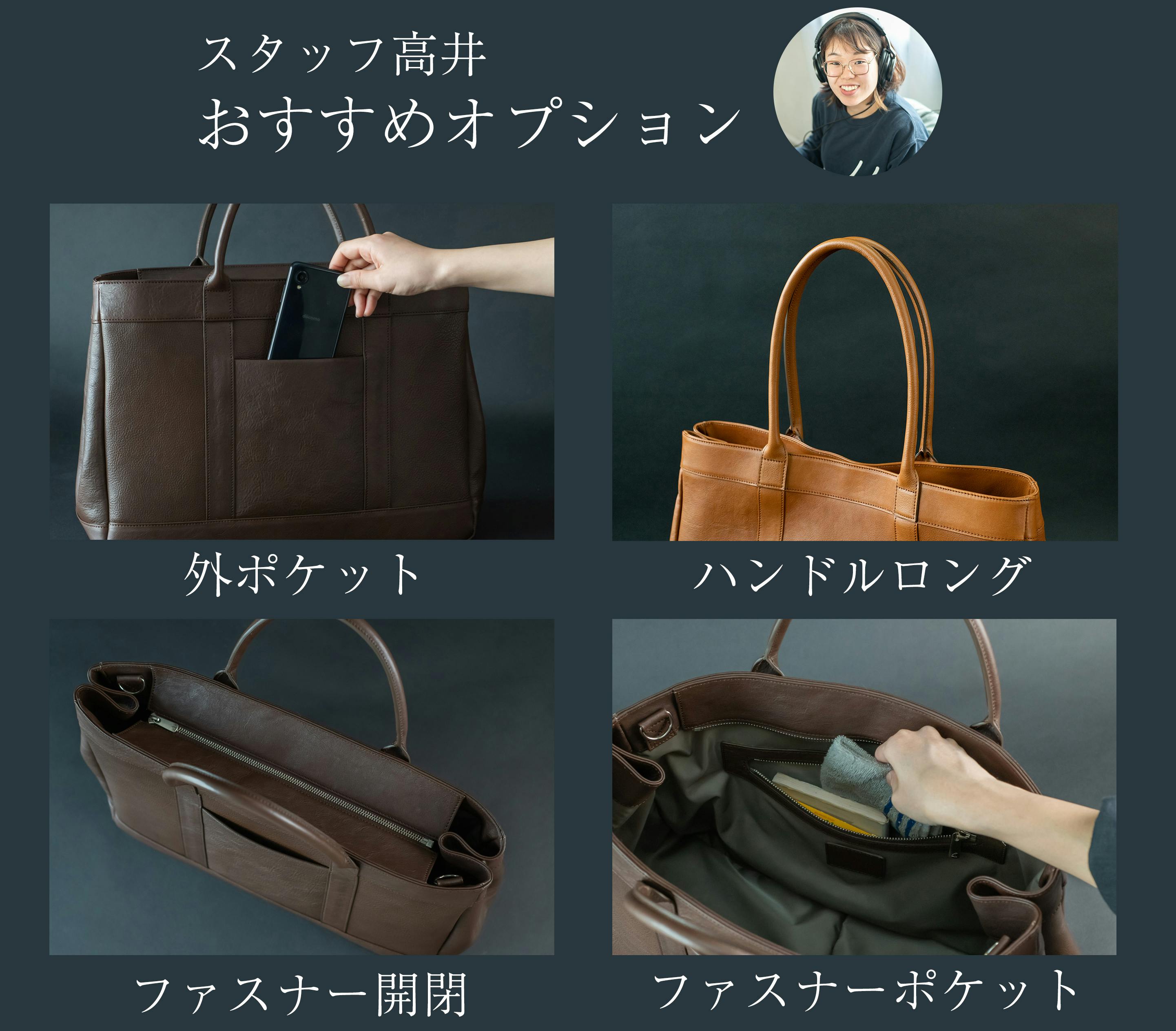 海外旅行が大好きな高井さんが選ぶオプションは「外ポケ・ファスナーポケット・ファスナーでの開閉に変更・ハンドルロング」の4つでした!!