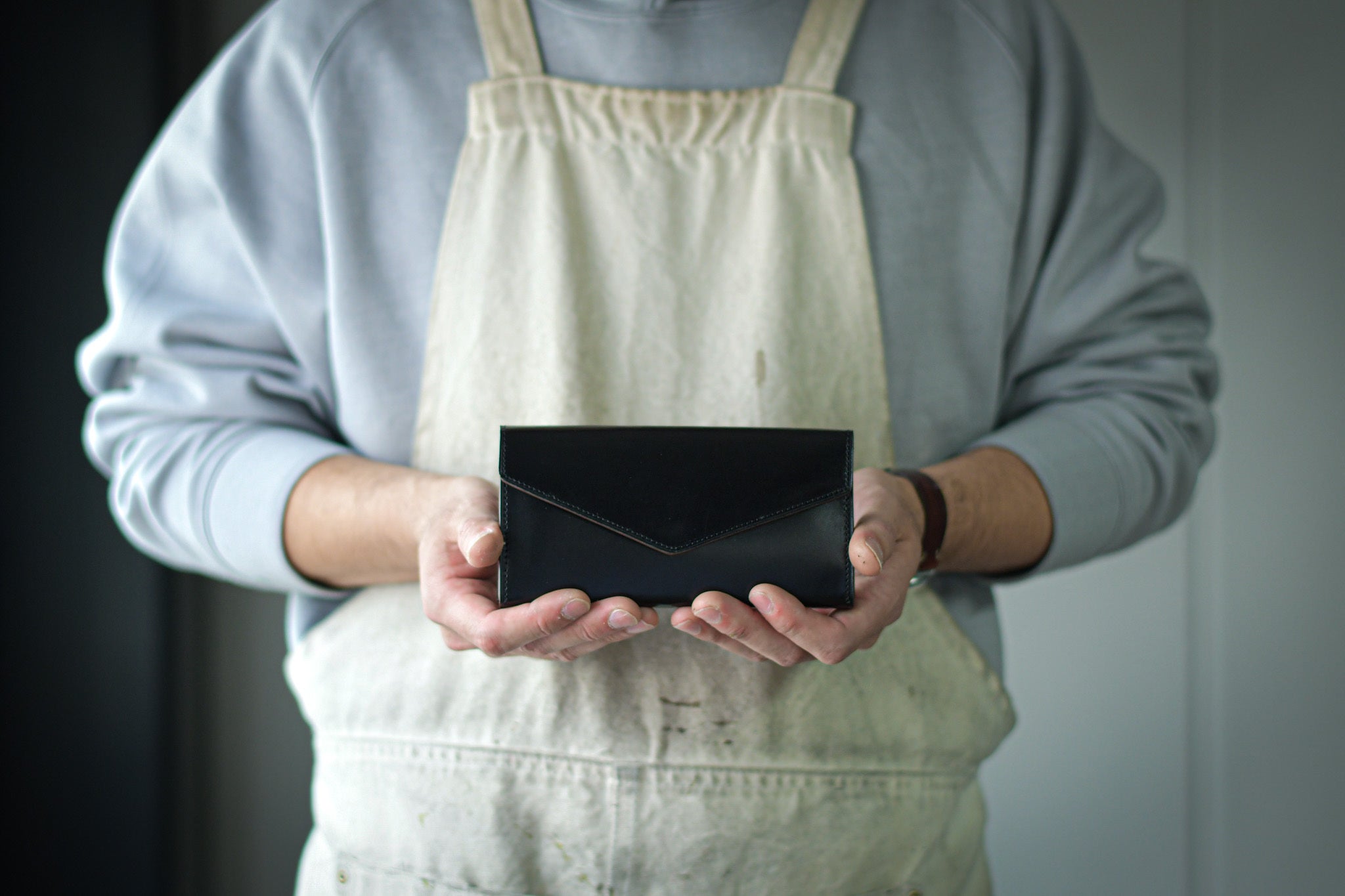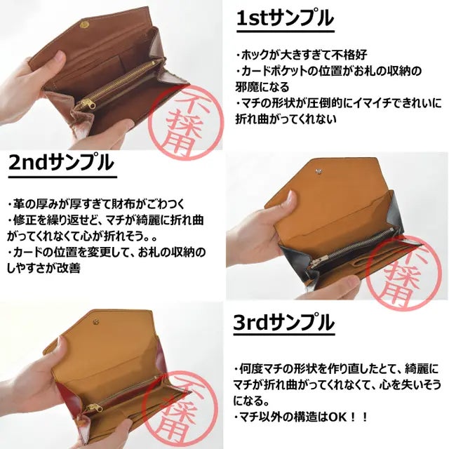 きっかけはお客様の声でした。「流行りに流されてコンパクト財布を買ってみたものの、今まで使っていた長財布に比べて、お会計の時にモタモタしてしまうし、あまり実用的ではなく、使いづらいんです。」そのリクエストのことを考えて考えて考えていれば、「ハッ!!」と気づきました。自分が財布職人であるということに。笑それと同時に「ないなら作ればいいんだという事に。」そしてようやく答えにたどり着きました。