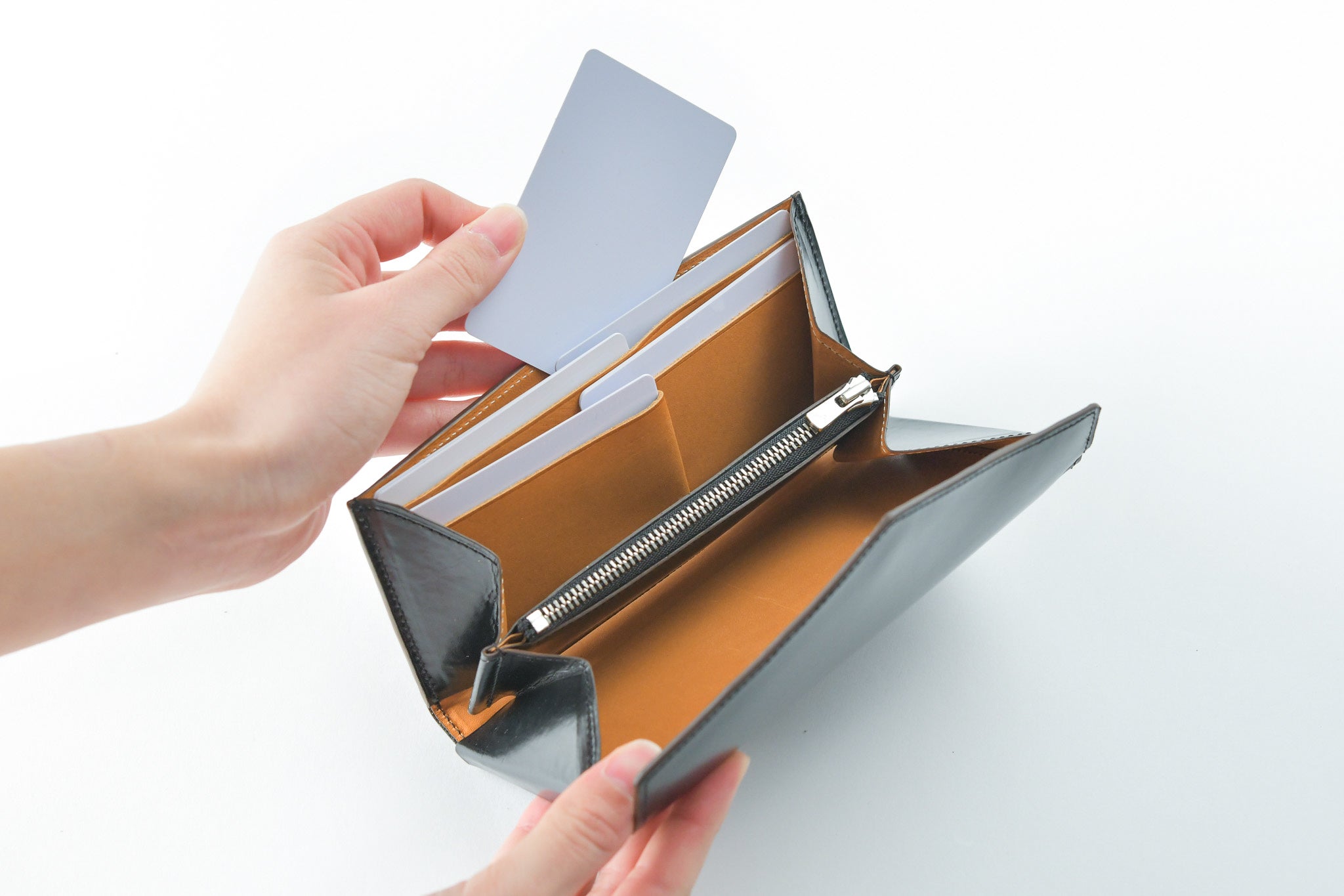 流行りに流されてコンパクト財布に移行してみたものの使いづらくて、長財布に戻ってしまっていました。そんな最中、極小の長財布という願ったり叶ったりのサンプルが完成したので使ってみたら、想像通り使いやすいのにコンパクトでした!カードの出し入れもしやすく、ガバッと大きく開くので、中が見やすい。もう、今までの財布には、戻れなくなってしまいました(笑)
