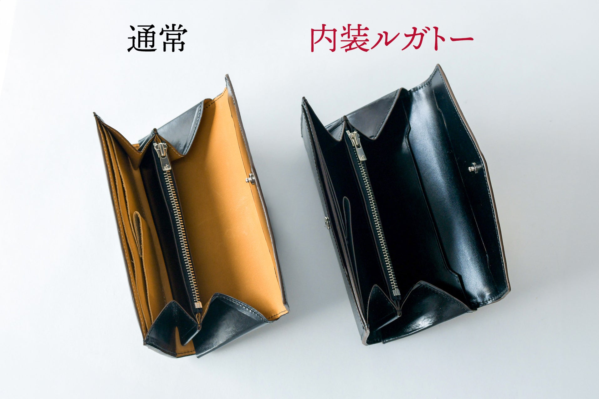 「今回使用したルガトーはトラと呼ばれる模様と深く透明感のある染色が特徴で、その美しい表情から革の宝石とも呼ばれています。エクセラファスナーのエレメントの輝きに引けを取らないツヤ感になっているので高級感がグッドです。」(職人 千秋)