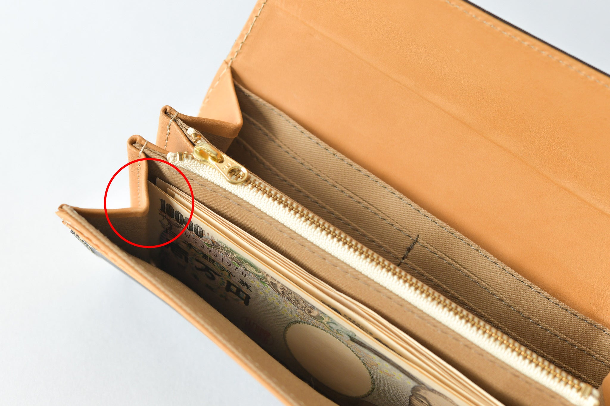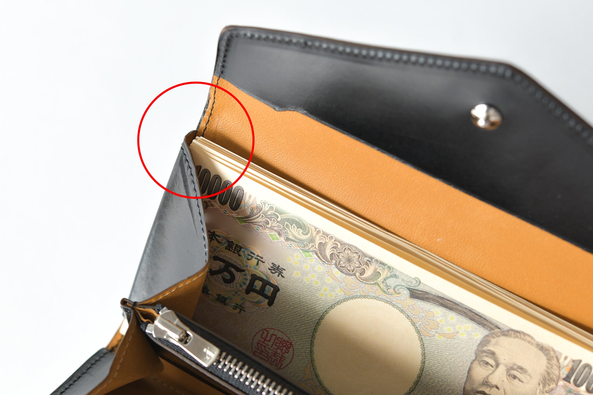 フラップの長財布を使っていて、お札の端が折れてストレスを感じた経験ありませんか?原因はマチに使われている革がお札の角に接触することでした。