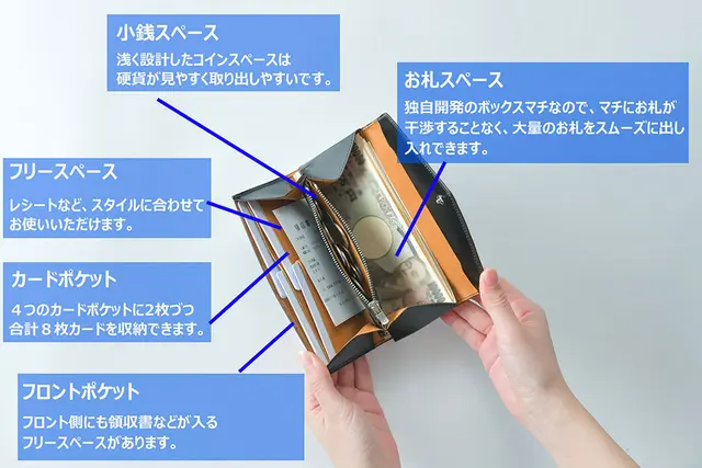 ボックス型のマチなので、従来のお財布のようにマチが干渉しないのでお札を大量に収納することができます。