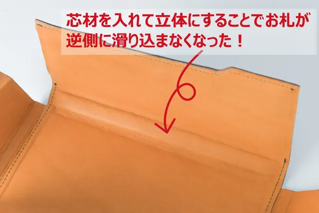 芯材で底部分を盛り上がらせて「お札ストッパー」をつけたことで、、