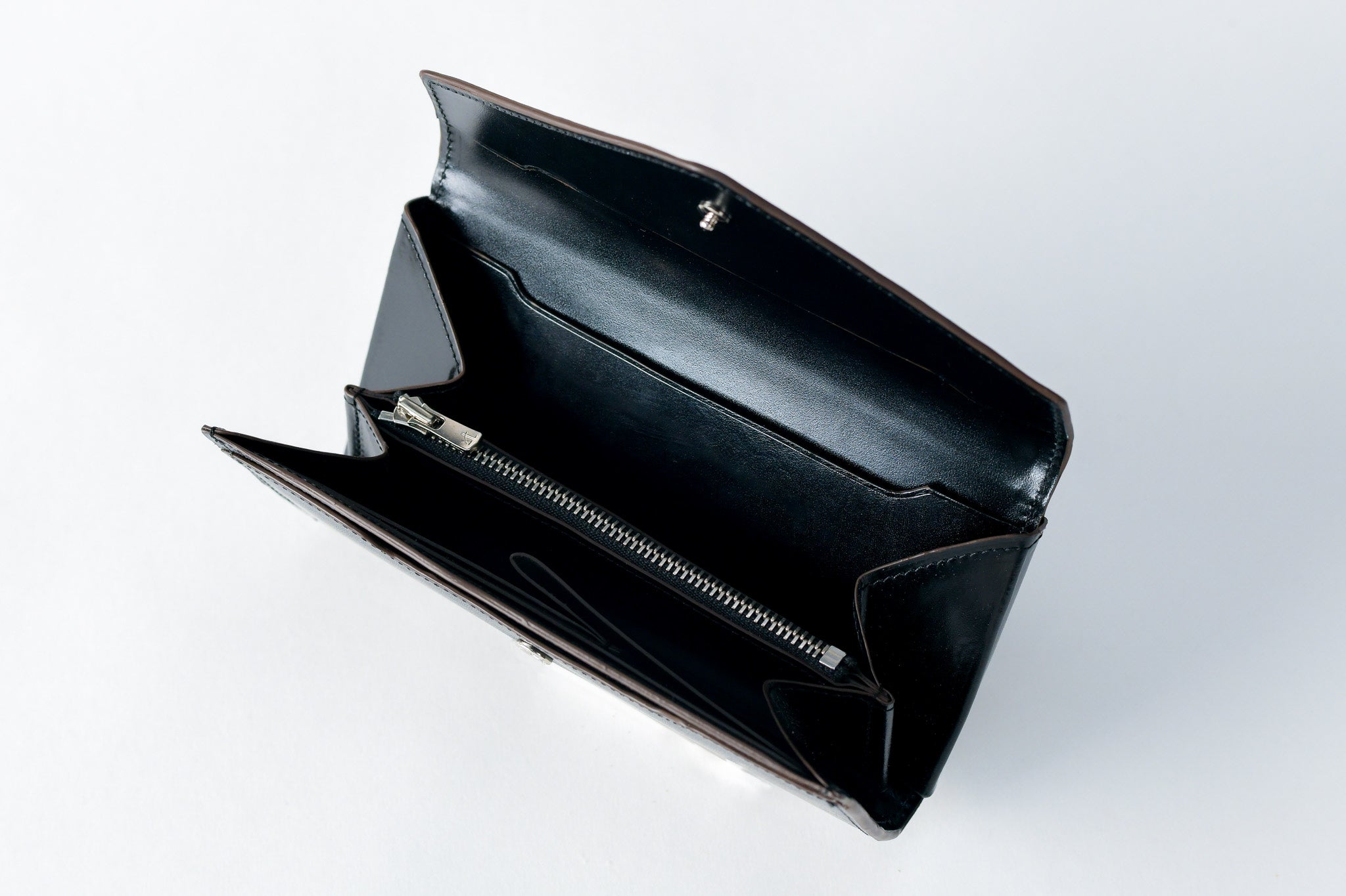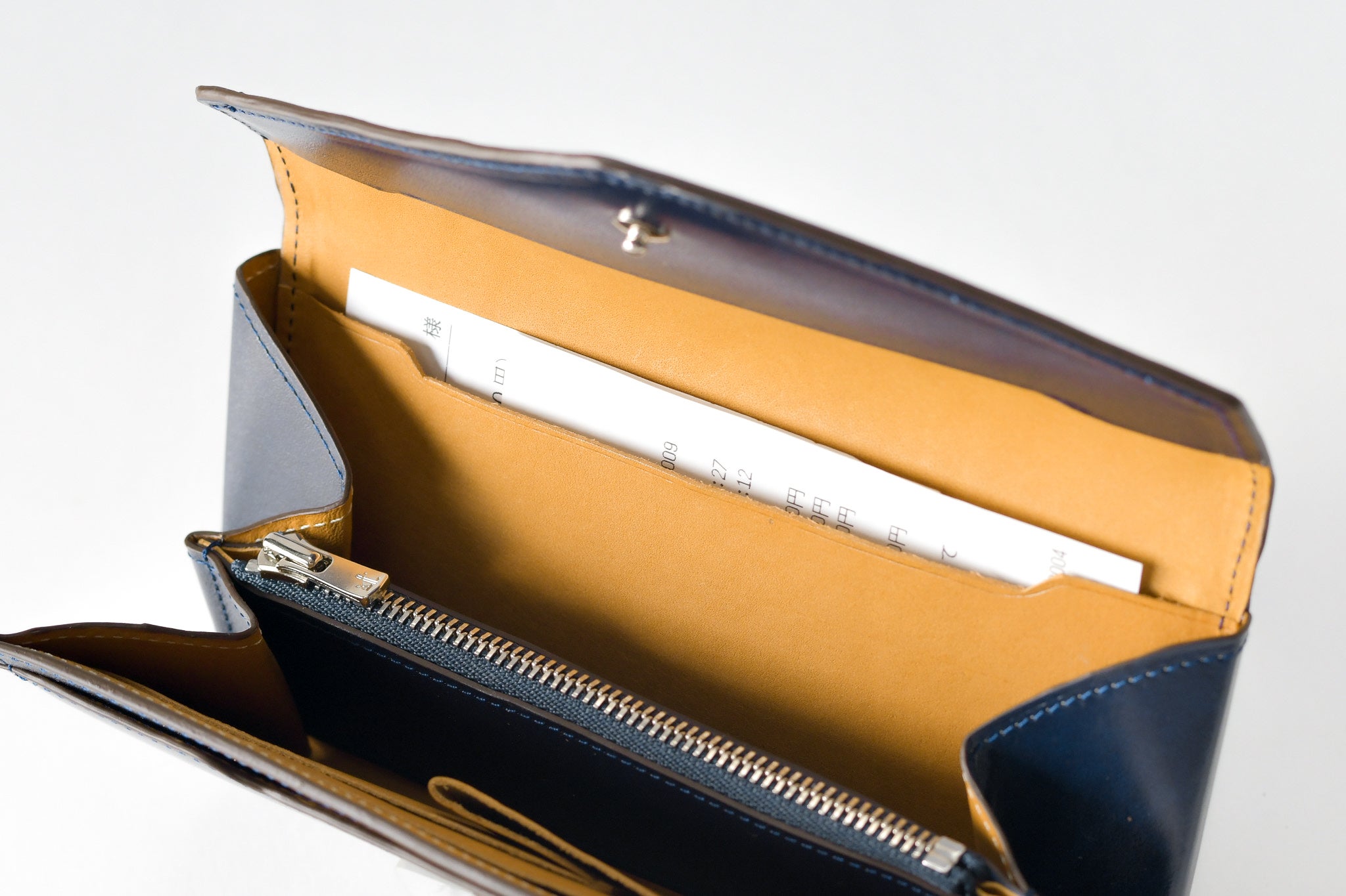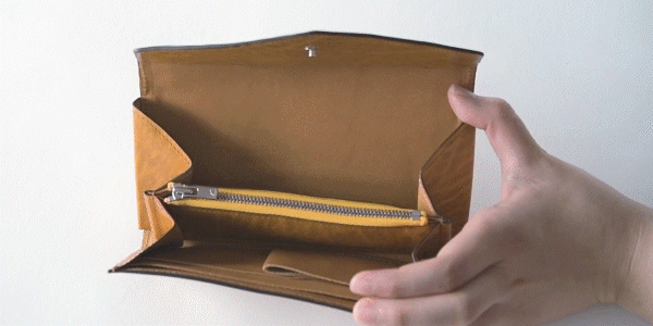 きっかけはお客様の声でした。「流行りに流されてコンパクト財布を買ってみたものの、今まで使っていた長財布に比べて、お会計の時にモタモタしてしまうし、あまり実用的ではなく、使いづらいんです。」そのリクエストのことを考えて考えて考えていれば、「ハッ!!」と気づきました。自分が財布職人であるということに。笑それと同時に「ないなら作ればいいんだという事に。」そしてようやく答えにたどり着きました。