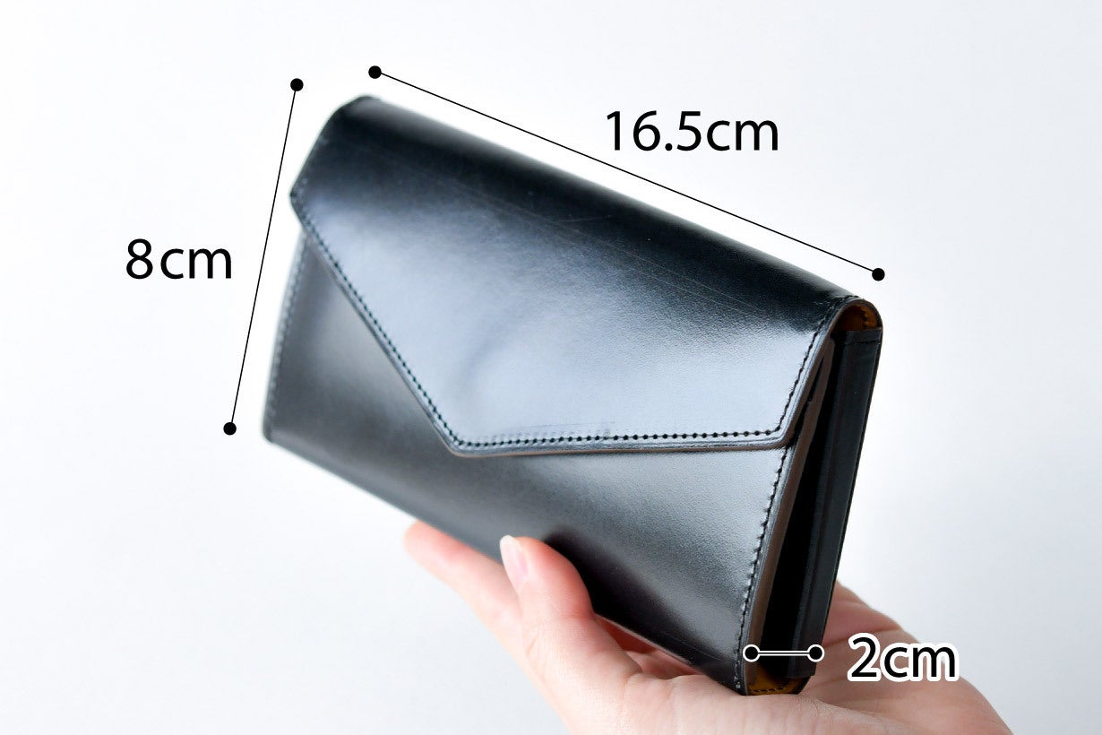 「『最近、ミニ財布をよく見かけるけど、やっぱり長財布がいいんです。でも、やっぱり長財布は大きくて…小さい長財布って作れないですか』というお客様からのお声。ミニ財布が流行っているとはいえ、まだまだ根強い人気の長財布。【財布小さくしたい】【でも、長財布がいい】実は私もそんな1人。職人さんが完成させたサンプルを見た瞬間『これ!!このサイズと形!!』と叫んでしまいました。」(スタッフ 山田)