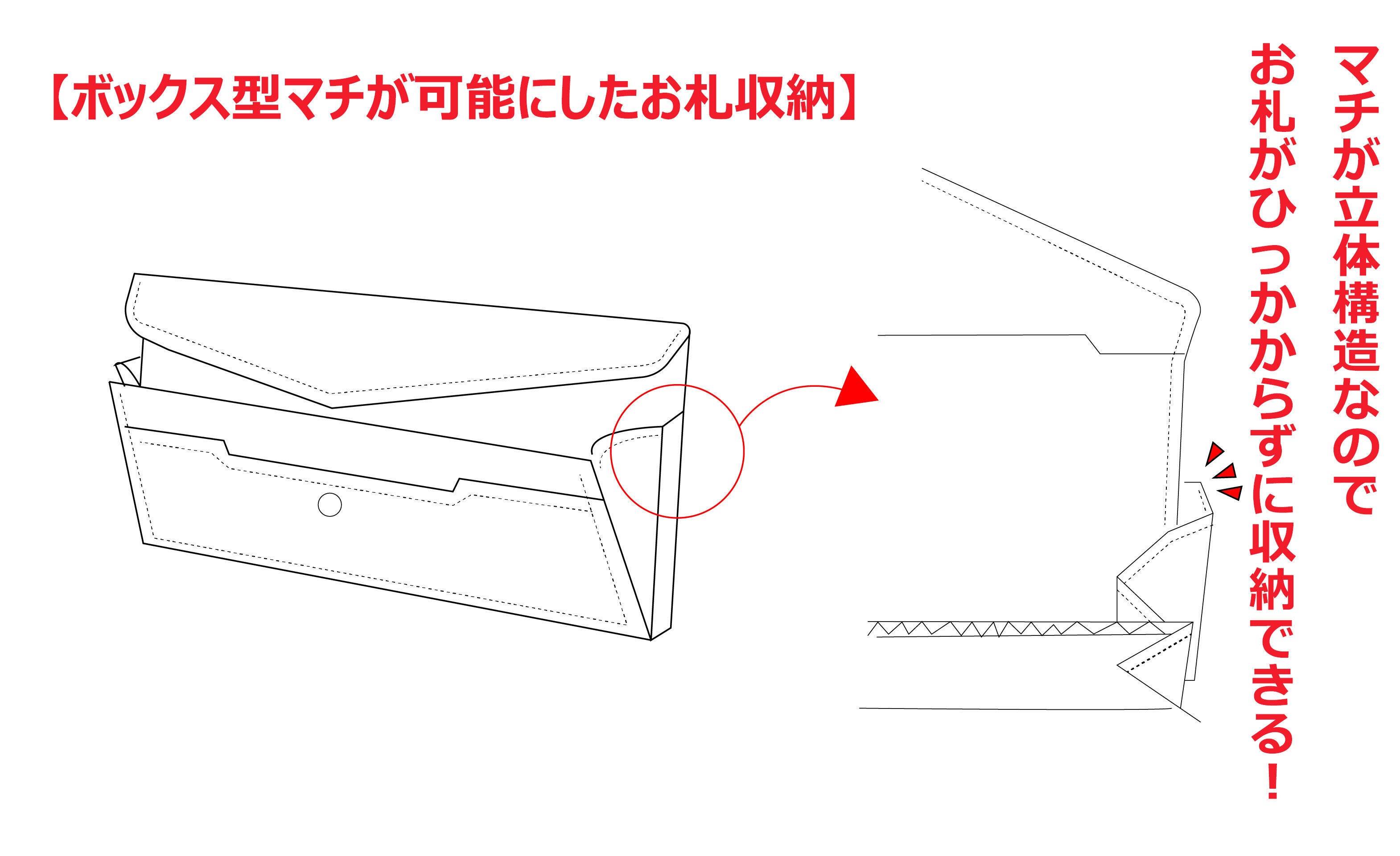 マチと呼ばれるパーツをボックス型にしたことで、お札に角にマチが接することがなくなりスマートにお札を収納することができるようになりました。